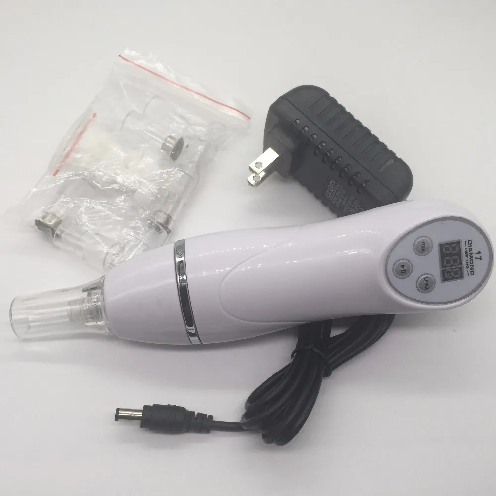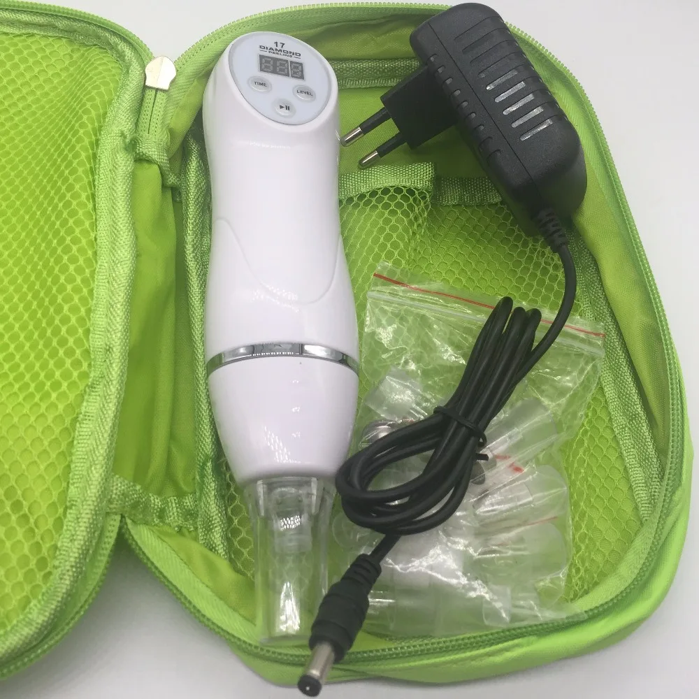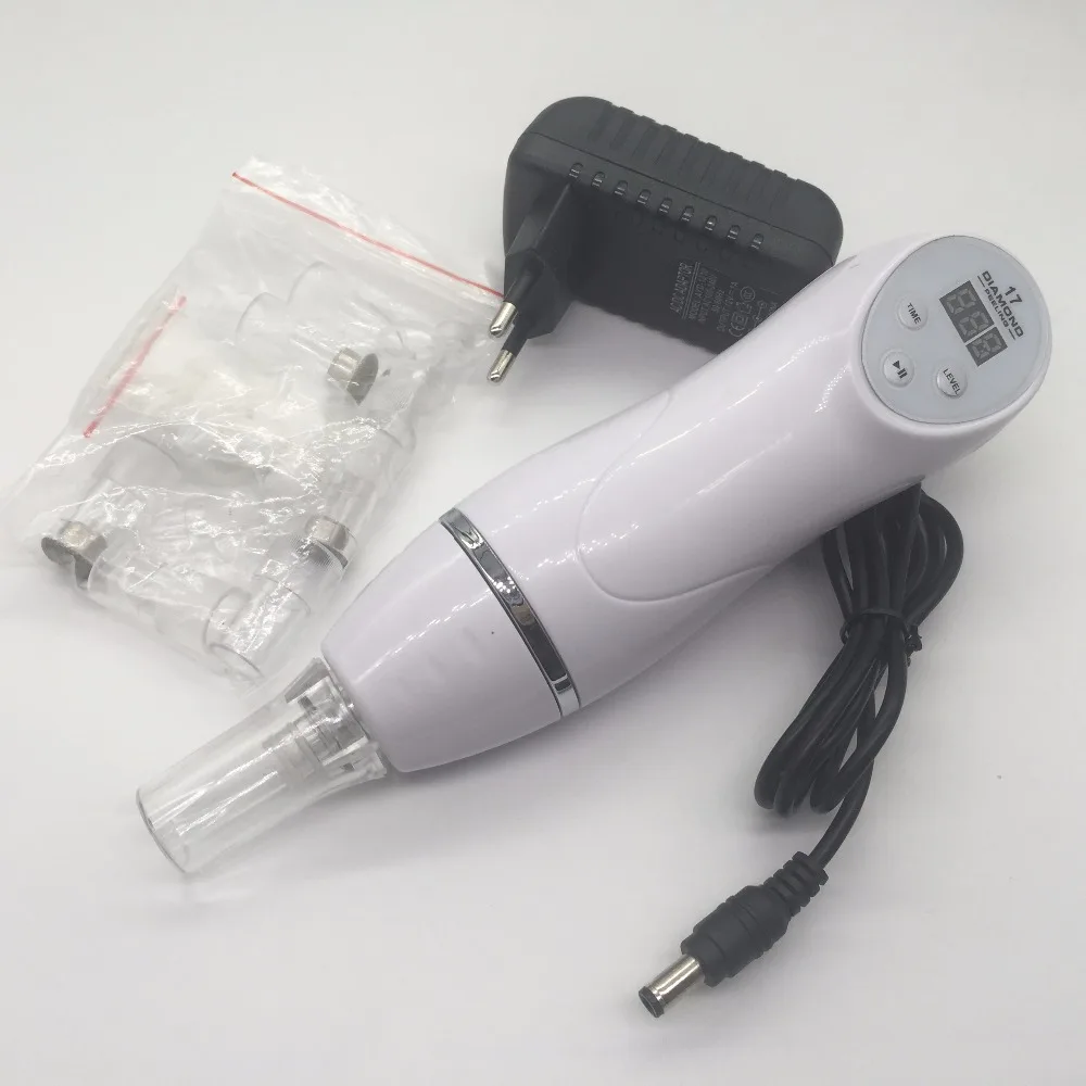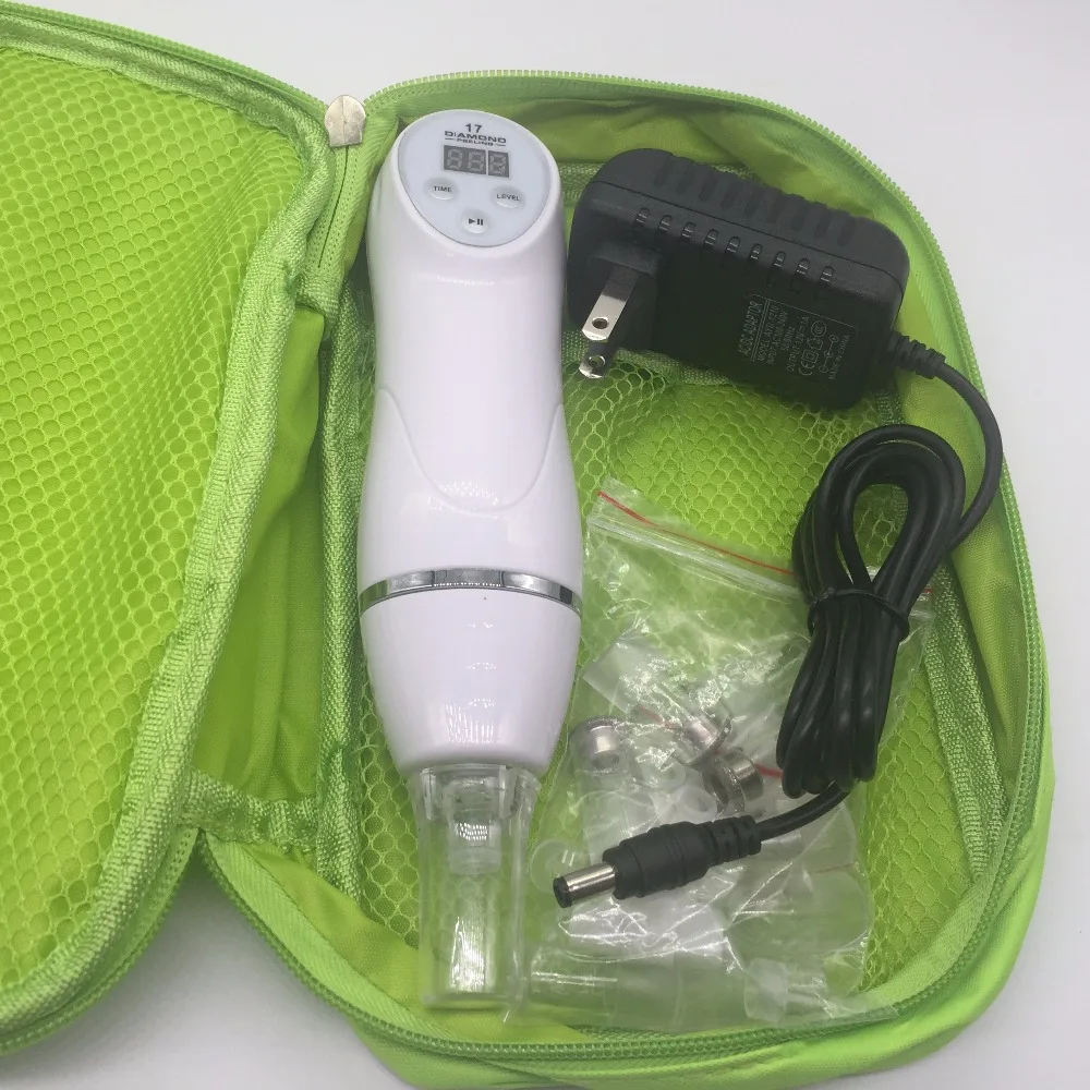 Mini Diamond Dermabrasion Skin Peeling Beauty Machine with Vacuum for blackhead and acne removal and face cleaning facial Pore Cleaner equipment -(1) -(2) -(3) -(4) 1       aeProduct.getSubject() 10 9   Face Clean Portable 7 Tip Diamond Dermabrasion Blackhead Vacuum Cleaner Suction Removal Scar Acne Pore Peeling Skin Care Device Product advantages: 1.Diamond Dermabrasion makes use of a patented diamond dermabrasion tube, combined with inlaid diamond particles of different thickness of the diamond carved heads, and rub back and forth by the way, and with instruments to control the intensity of suction vacuum suction, the skin wore a shallow layer is a non-invasive, shallow dermabrasion physical nature. 2.This kind of purely physical, mechanical principles, compared to acid peels and chemicals removed from your critical skin layers, do not irritate the skin with a mild advantage. It is suitable for very sensitive skin. By the suction size and thickness of the miniature diamond dermabrasion to control shades. It's less irritating and after the operation would not have bothered to take care of the wound. It is not easy to have pigmentation or redness of skin problems, and do not have a crystal particle when operating scattered residual problem, the whole process is very clean and safe. 3.Diamond Dermabrasion can be used to improve the skin's pigmentation disorder, shallow pock youth, age spots, rough skin after sun exposure and ageing facial lines. It can also promote skin renewal, skin showing smooth to the touch immediately after surgery ......After diamond dermabrasion treatment, you can do the ultrasonic import or use whitening preparations, with an ice compress, then the result will be better. Functions: 1.Diamond Dermabrasion role in the dermis, making skin 2.activation, repair and regeneration 3.For acne, acne skin treatment 4.Treatment for the dry skin 5.Treatment for the sagging skin and wrinkle 6.Treatment for the stain and dull skin 7.Treatment for skin hyperpigmentation Features: 1.Small, lightweight, easy to carry 2.3 different degree of thickness of diamond tips 3.3 different size vacuum treatment heads 4.Double filtration device, easy to clean, prevent the obstruction into the interior of the machine effectively 5.Suitable for different kinds of skins, also sensitive skin. 6.No excitability, no stabbing pain, no need to anaesthetize. 7.By physical microdermabrasion, easily controlled, no side effect, safety. 8.Non-invasive treatment, no excitability, no pain. How to use: STEP 1: Clean your face, use the blackhead educe liquid or facial steamer to open the pore. STEP 2: According to your requirements, choose among the Five Level Suction. Start with the lowest. STEP 3: Move the blackhead cleanser back and forth around the pore with a constant speed, slowly move, do not stay in one place for too long to avoid injury, and do not press it hardly or pull vertically. STEP 4: After washing your face, please use an ice towel or cold water or shrinking liquid to restore the treated pore. Notes: 1. Please don't suction on the same area all the time, it will make the skin swell. If the skin swells, stop using it immediately. 2.Before using the product, use a hot steamer or hot towel or blackhead remover gel/cream on your skin for 5 minutes to completely open your pores first to ensure the best performance of the product. Product parameters: Color: White Power:16w Voltage: 110V-240V /50-60Hz Treatment Area: Facial Weight: 2.2lb / 1kg Packing Size: 9.4 X 7 X 3.5" / 24 X 18 X 9 CM Product List: 1. Diamond Dermabrasion Machine X 1 2. Diamond tips X 3 3. Vacuum treatment heads X 4 4. Filtration heads X 2 5. Filter sponge X 2 6. Power Adapter(EU/US) X 1 7. Full detailed English manual/instructions X 1 8. Green storage bag X 1