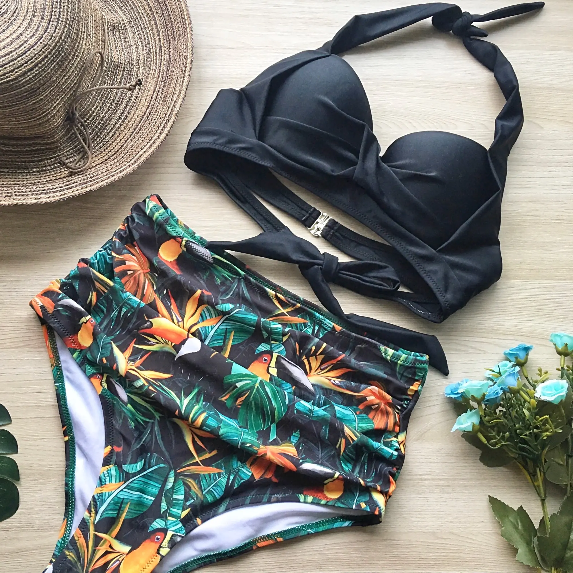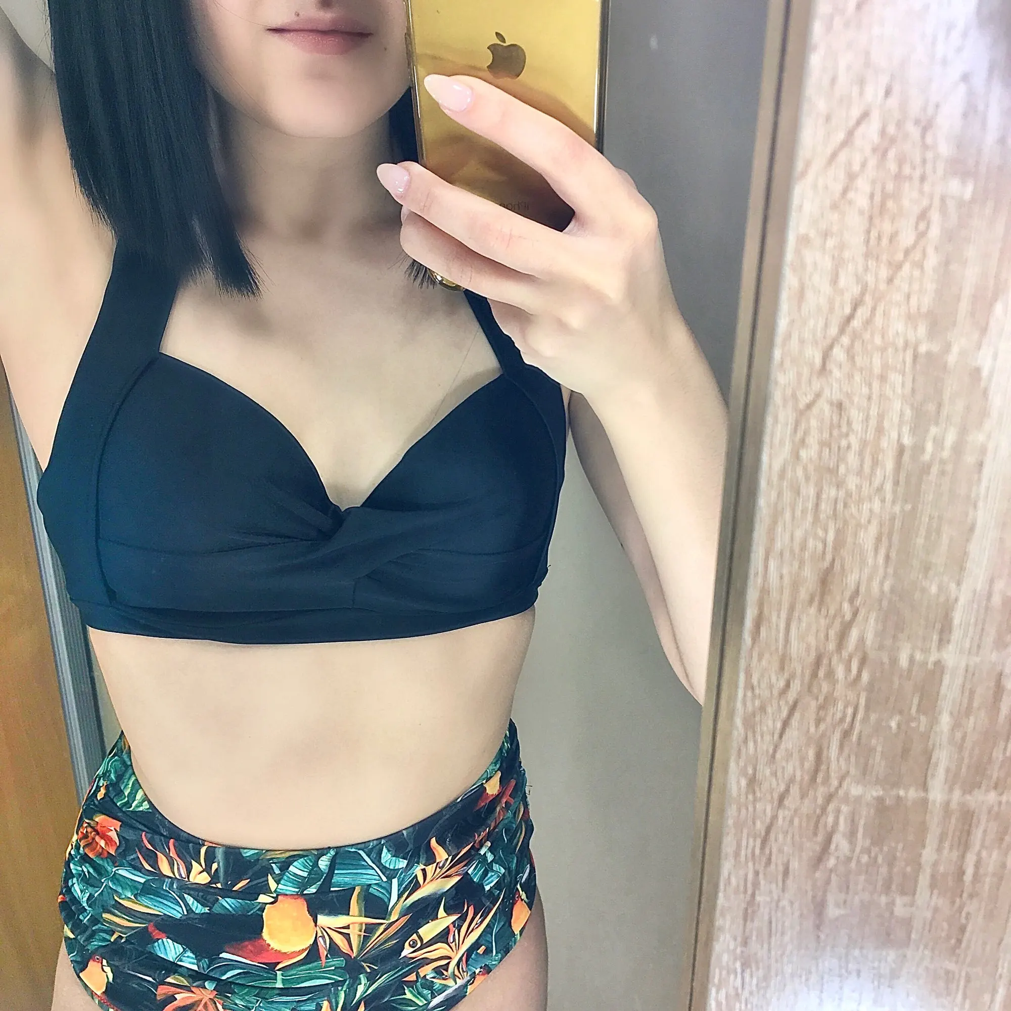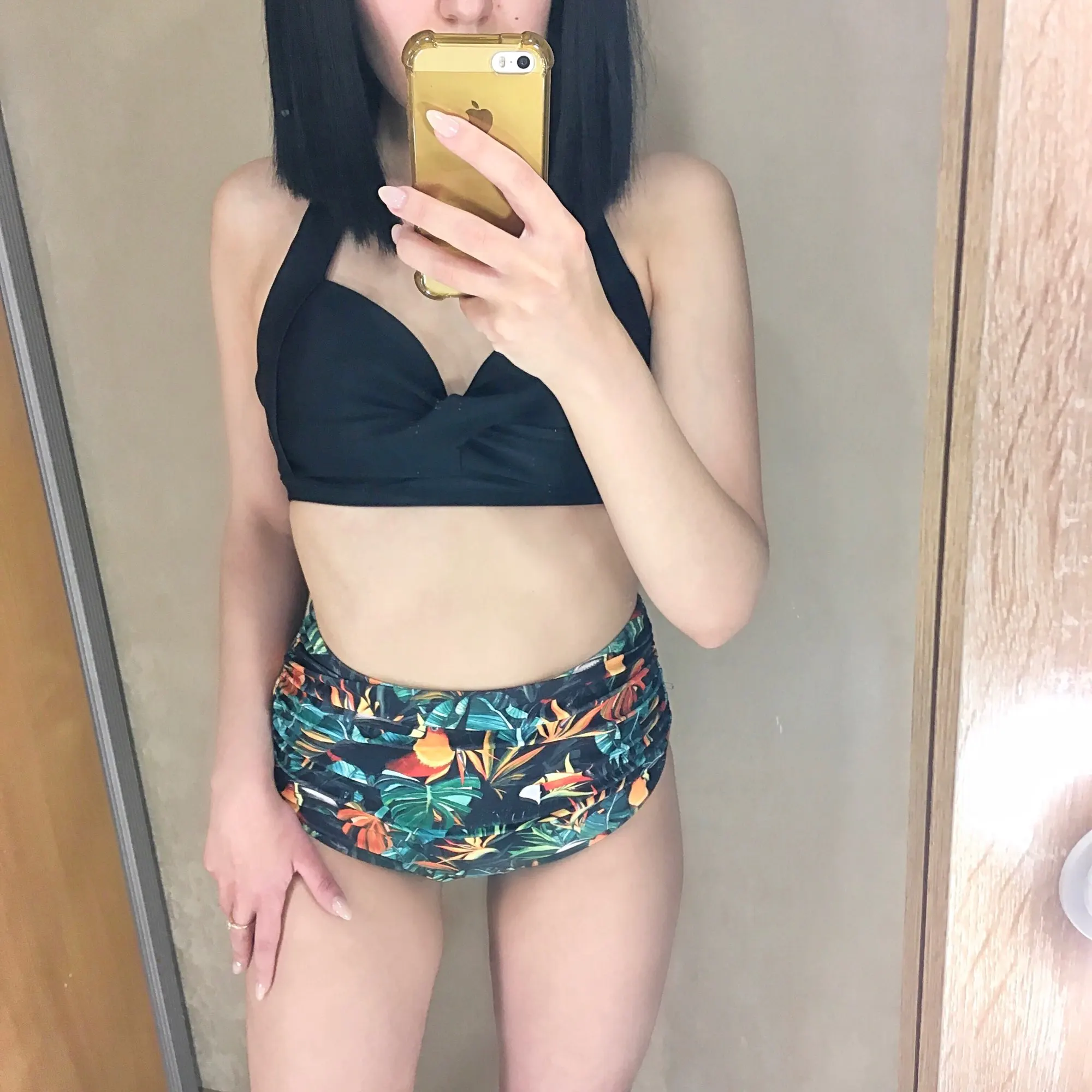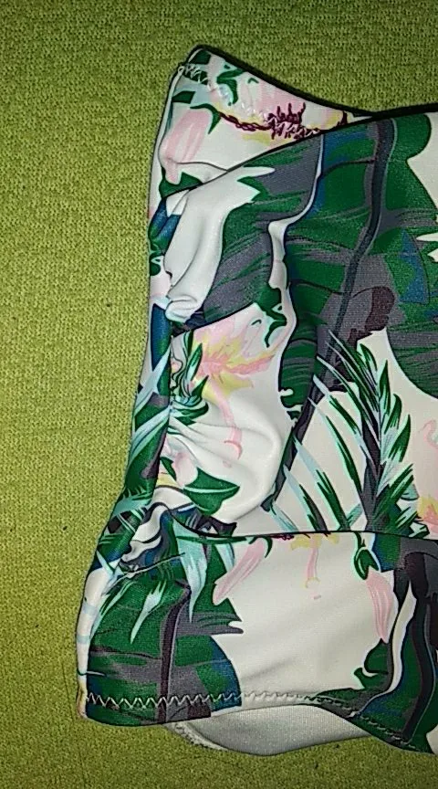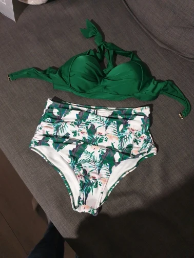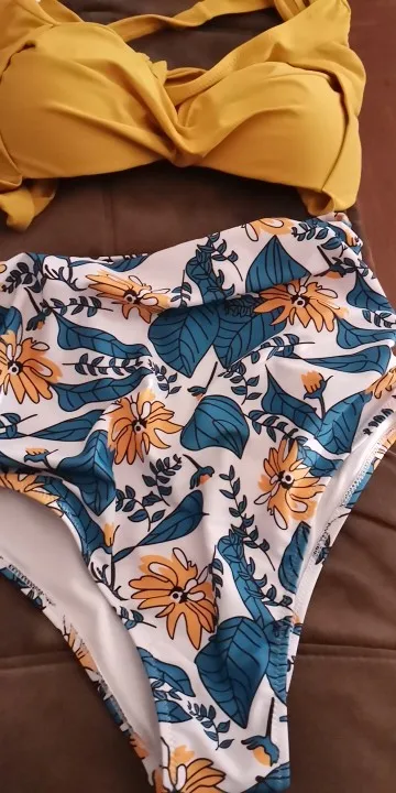 Swimsuit is cool. The seams are even, the strings do not stick out. Fabric is dense, elastic The bodice is on bones, with foam cups. Beautifully Raises the chest, making the shape more attractive. Behind the fastener and ties. Panties with a high fit won the waist. The bright print is now very relevant. In the store there are many interesting colors. On the parameters 83-63-88см, height 163 cm size S went well. The only thing I think, the growth of the panties will sit better. For me, landing is a bit high. But in general, I like how it looks. Quality is fire! Delivery 2 weeks