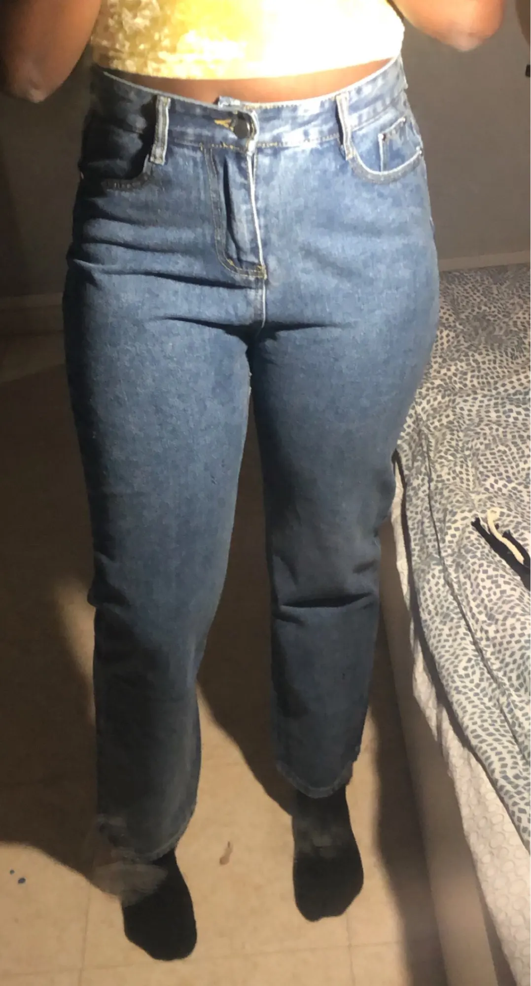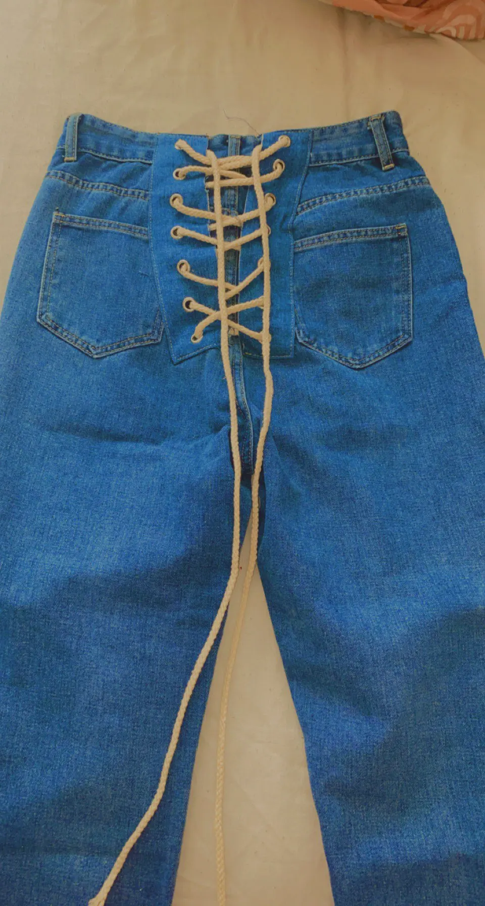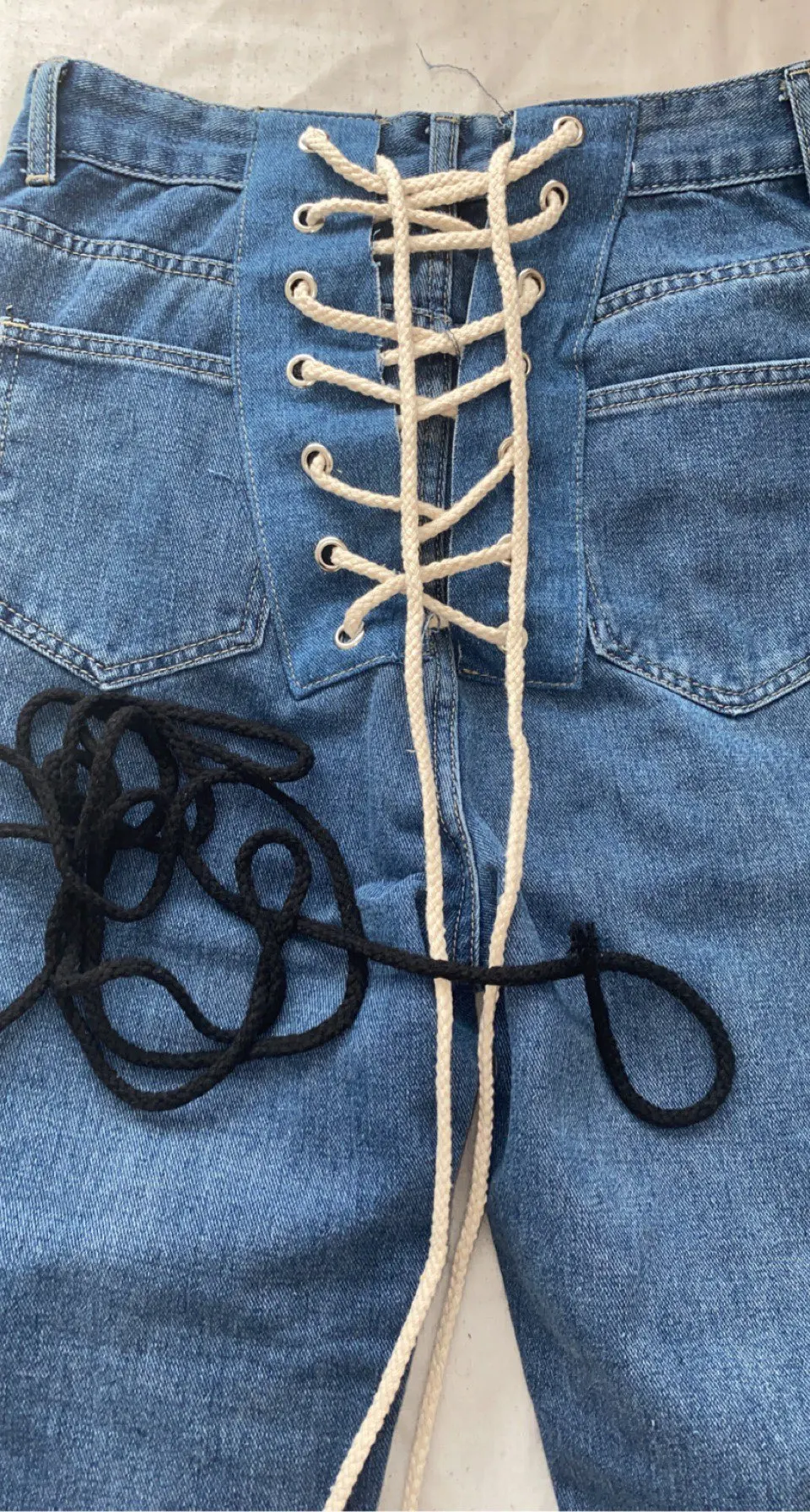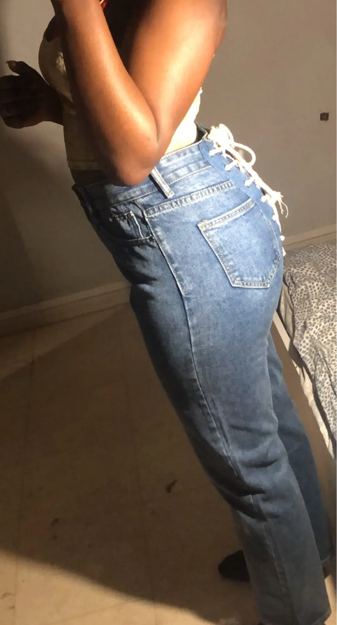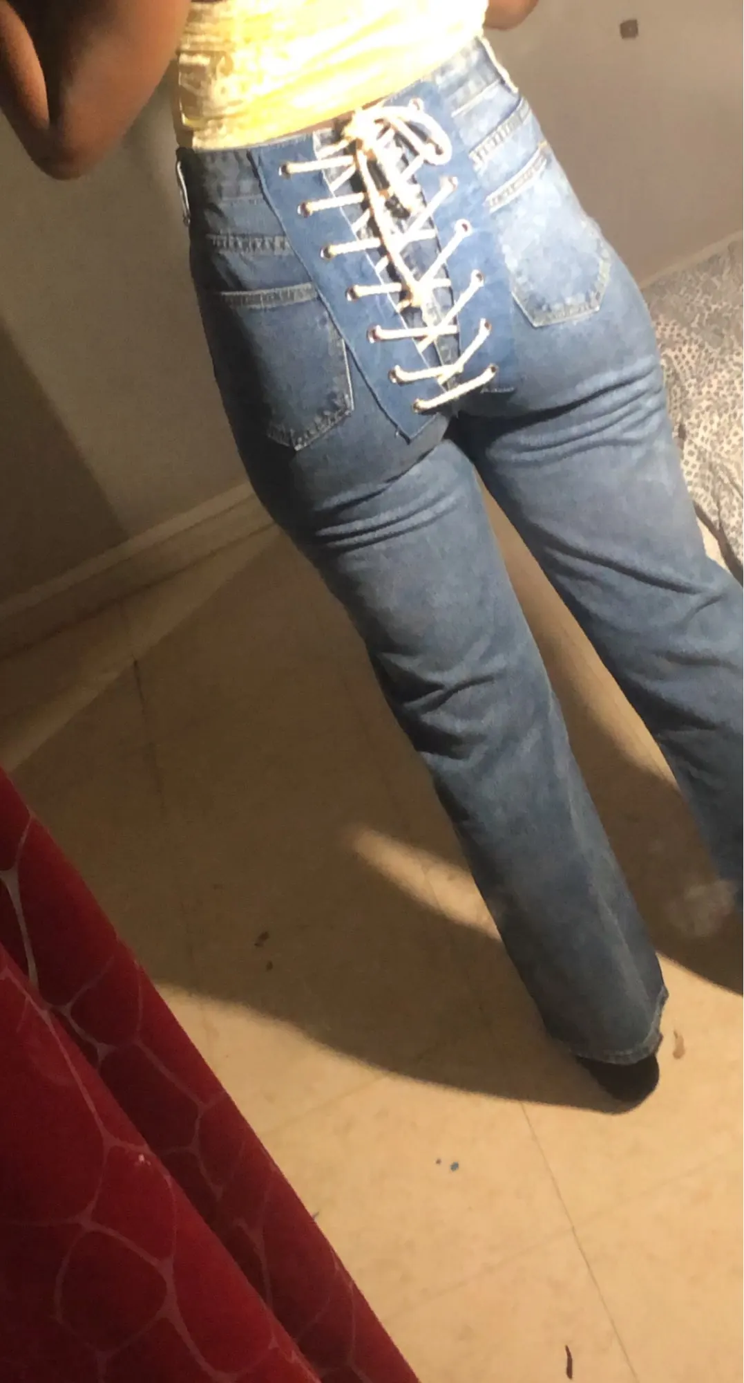 Excellent jeans i got a medium and have quite big thighs and a big bum an i couldnt get them past my thighs definately size up a size atleast however the jeans are great quality an come with black and white string love them