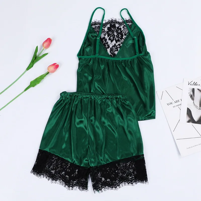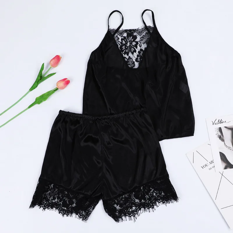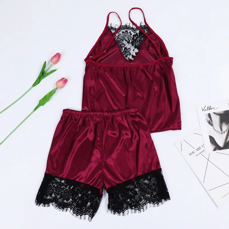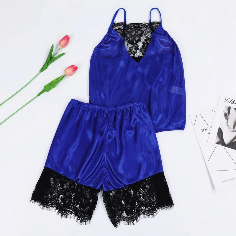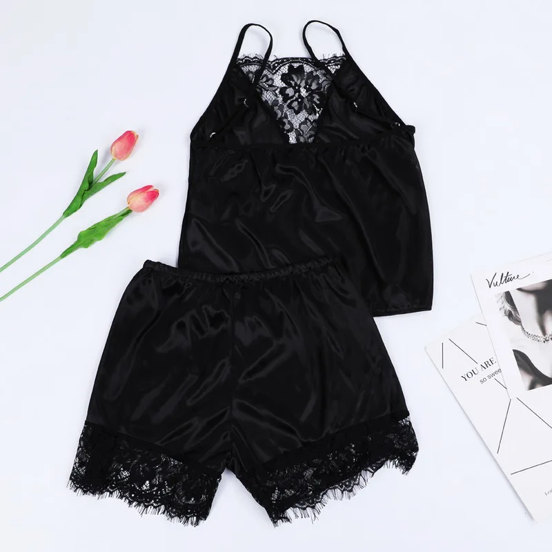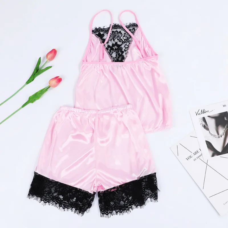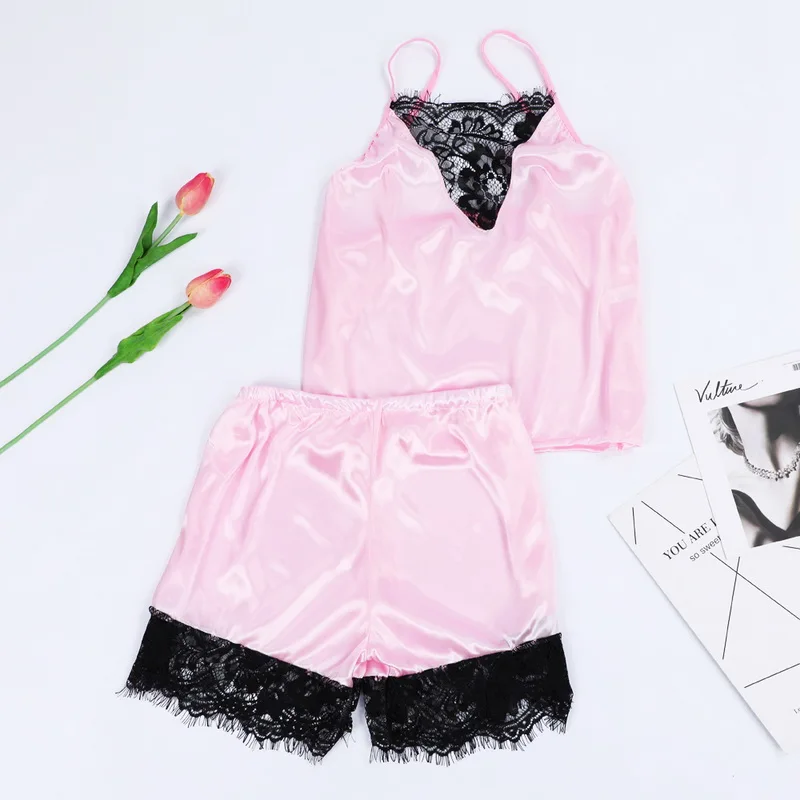 New Sleeveless 2Pcs Sleepwear with Trim Satin Cami Top and Shorts for Women in 2022.