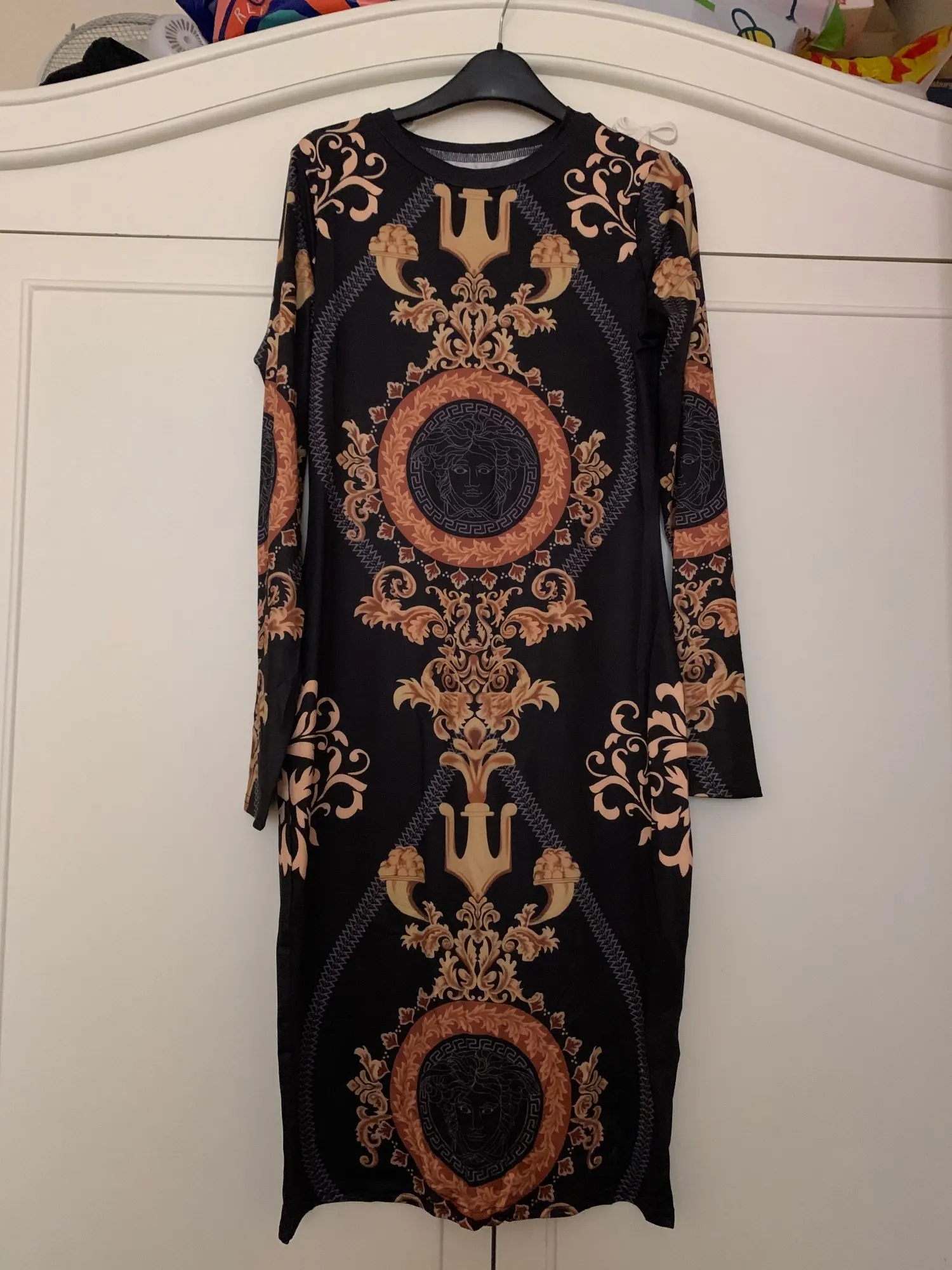 The dress is identical to the store's photographs. The drawing is well-centered, both on the body and sleeves. It's just as I expected. The package has arrived just in 15 days. I'm happy with my purchase.