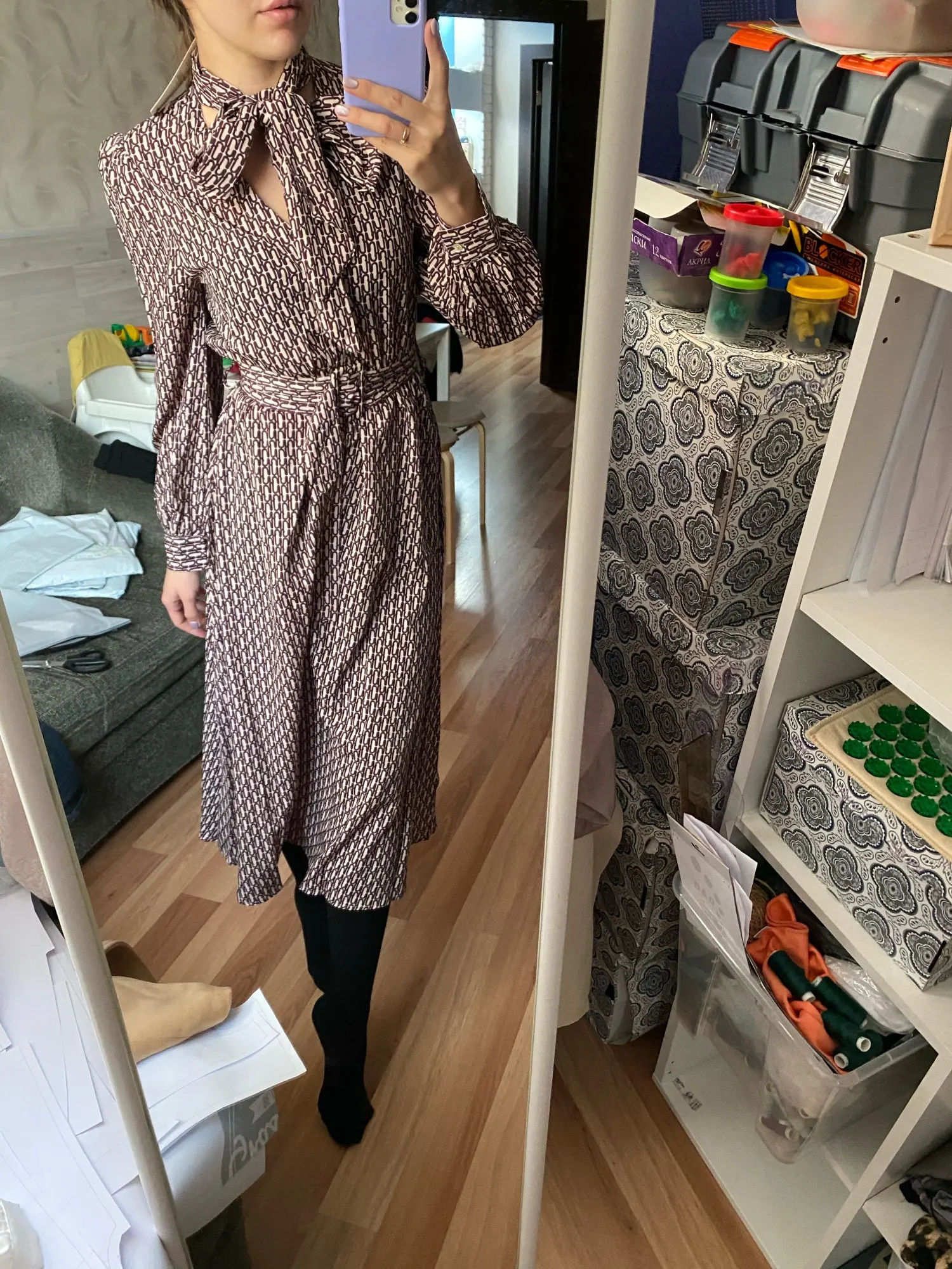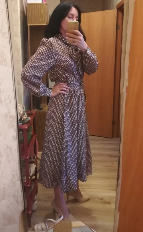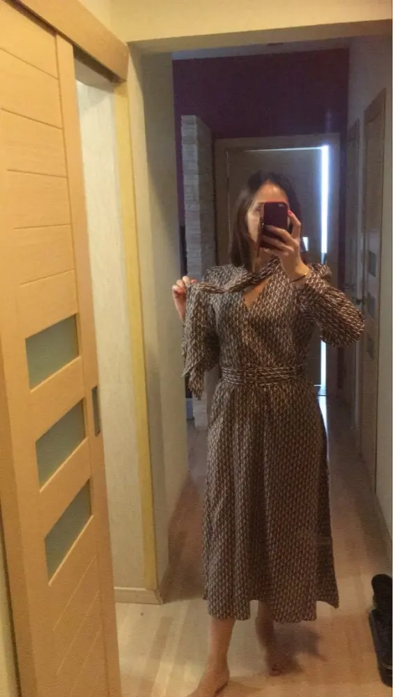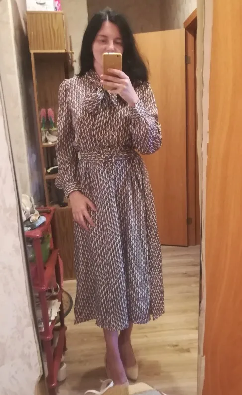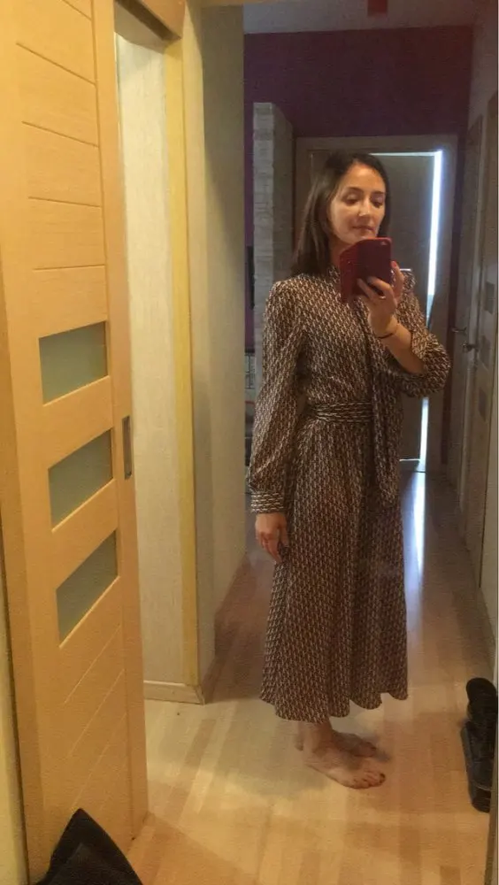 The dress is beautiful! At a height of 174 cm just below the middle of the shin. Excellent sleeve length. On the parameters 85-72-98, took the size L, slightly too big, you could take m. Sewn neatly. interesting design! Thank you store! Delivery 12 days to Moscow