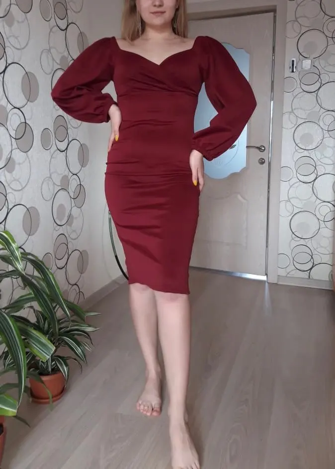 Dress fire, just super, quality is good. Borny or wine shade. It came 24 days before Siberia. Very well stretches, no leads, in some places stick out strings, but it's not scary. You need to put it over your head or through the bottom, there is no lock. The fabric is not very dense, does not pull. I ordered L for parameters 98/77/103, not much tight. The store quickly sent the order, I did not communicate with him, because there was no need. It is below the knee, behind there is a cut.
