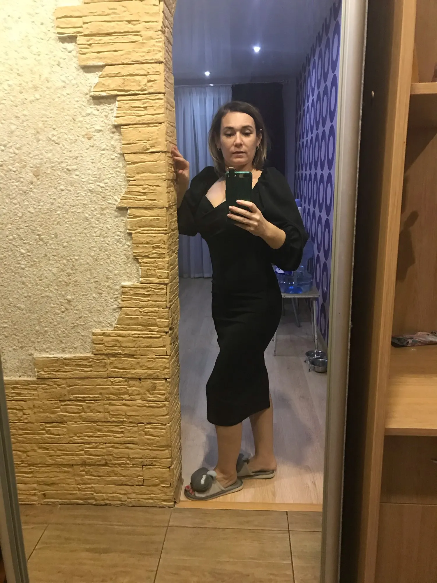 The dress really liked it. Synthetics, but not scary. Looks very worthy, as in the photo. Took L, 172 height, 98-76-102