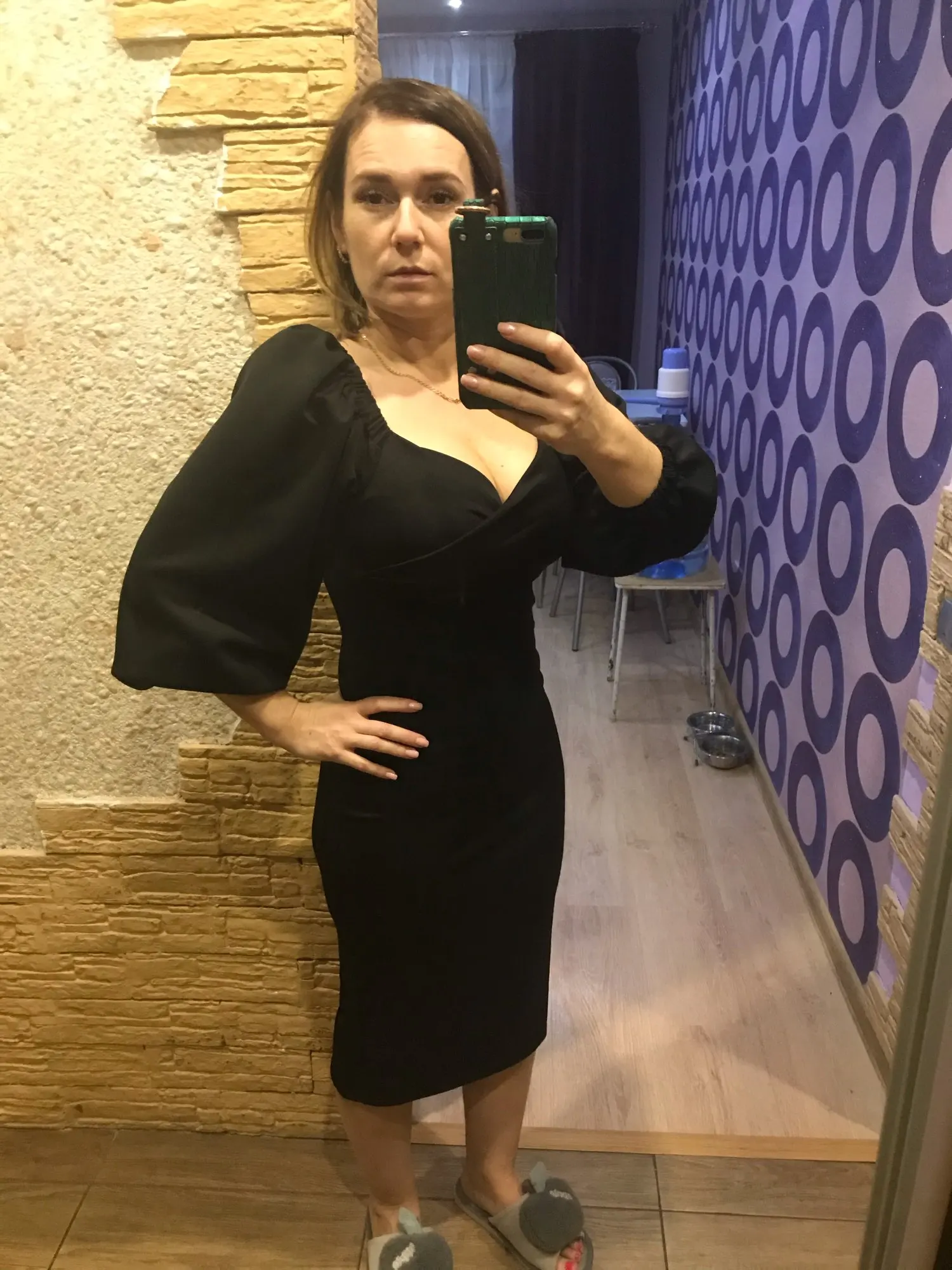The dress is cool, the fabric is dense enough. I read in the comments that at its size m with an increase of 169 it is better to take L, and was not mistaken.