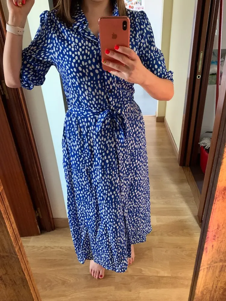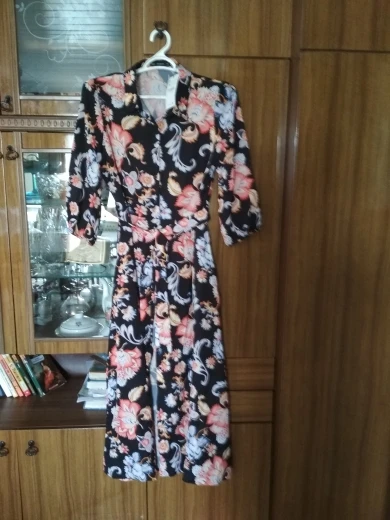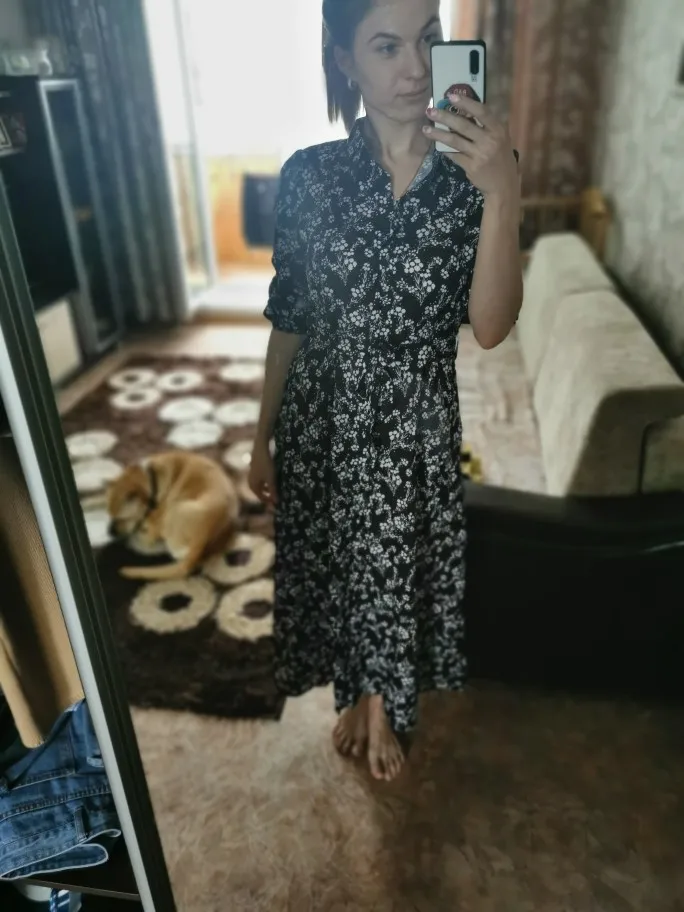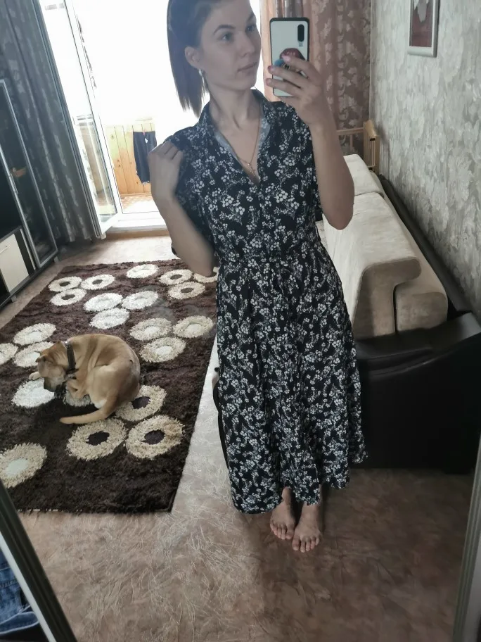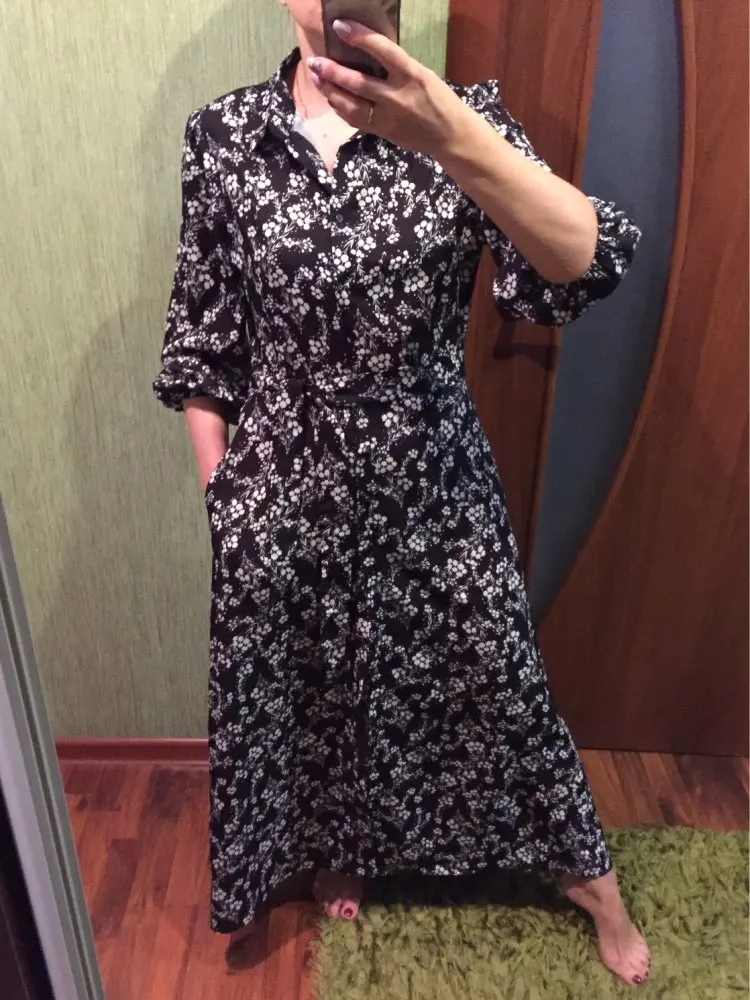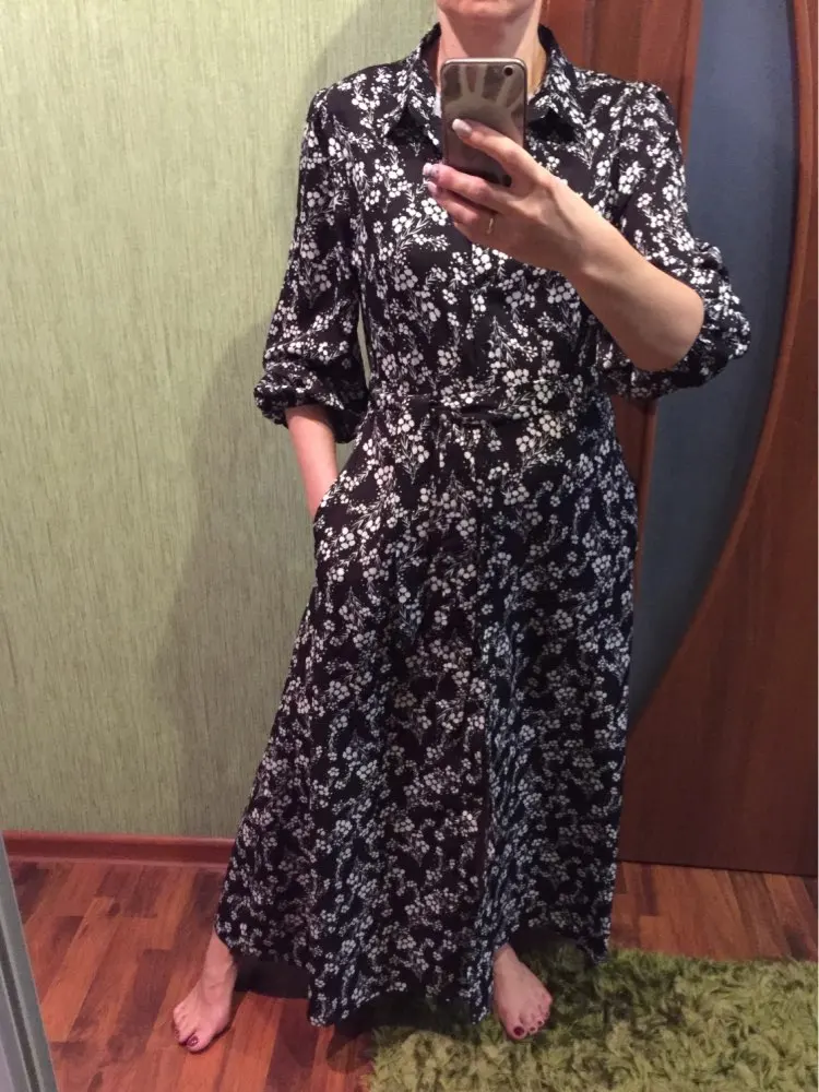 Vintage Floral Print Maxi Dress Women Boho Three Quarter Sleeve Long Dress Turn Down Collar Casual Shirt Dresses Robe   Awesome looking women's long maxi dress that will make you look stand out at every occasion.   Tag Size (cm) S M L XL RUS 42 44 46 48 US 4 6 8 10 UK/AU 6 8 10 12 EU 34 36 38 40 Bust 94 98 102 108 Waist 78 82 86 92 Shoulder 34 35 36 37.5 Sleeve 45 46 47 48 Length 130 131 132 133 Note:Please allow 2-3cm differences due to manual measurement.(1cm=0.39inch, 1 inch=2.54cm) If you don't know how to choose size, please contact our customer service.