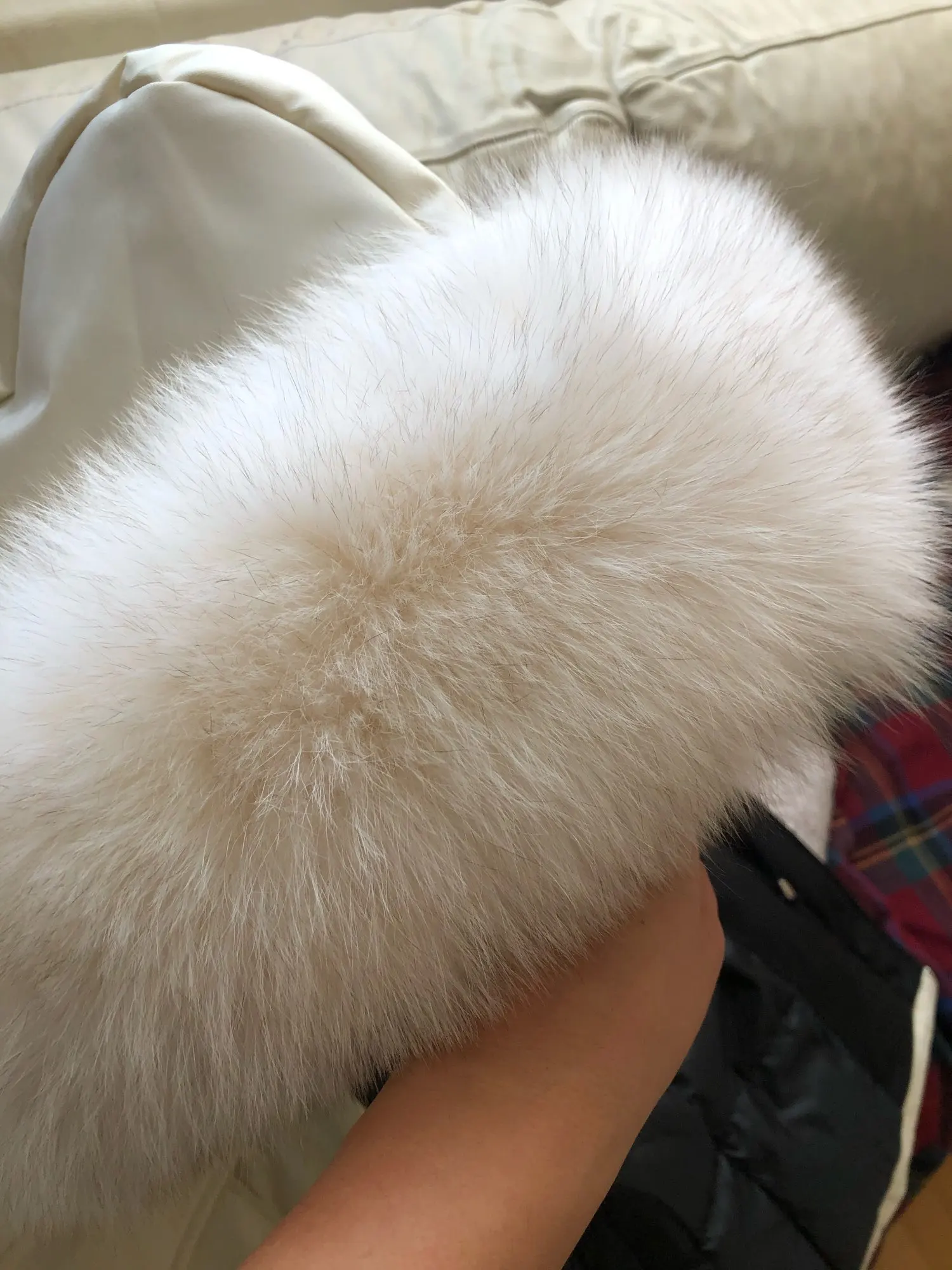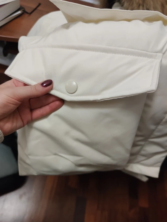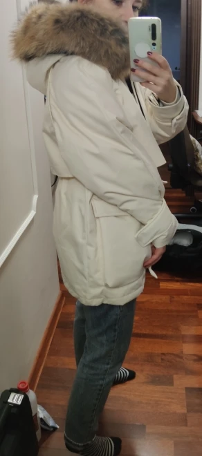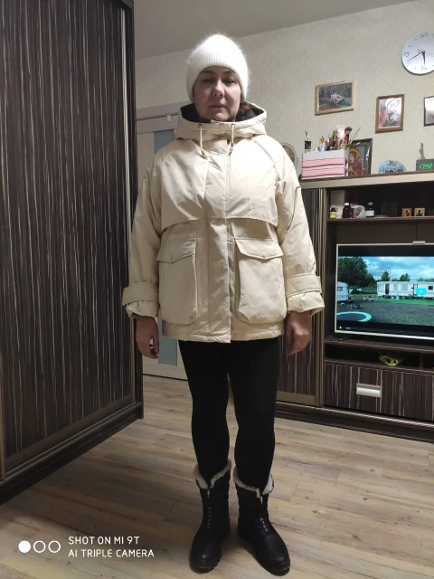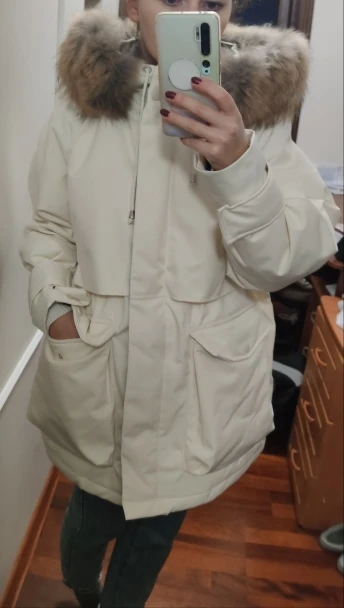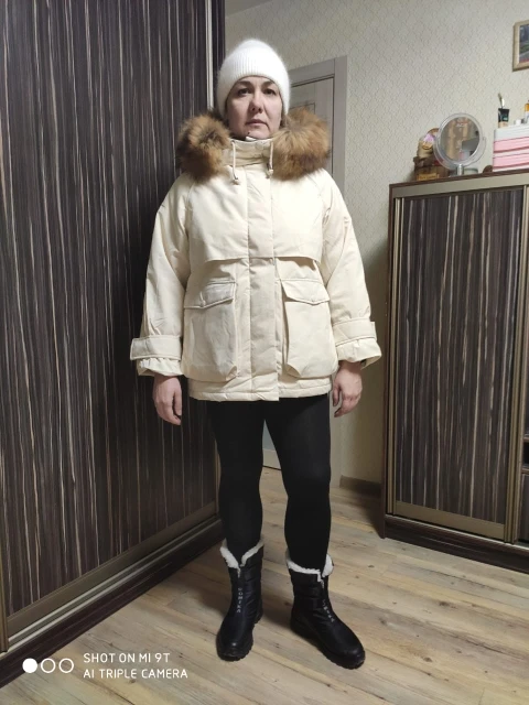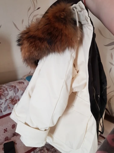 The jacket came two weeks before the Tyumen region Tracked. Fur fluffy natural, clings to buttons. On my height 158 cm, weight 47, 83-60-88 size XS just, straight as it should, shoulders on the ground, if the kuliska at the waist will free up look like an oversize. I feel like a doll in it. To-10, provided that from below you will blow the breeze, because it's like a platisko. The fabric is dense, the membrane. Ivory color. The hood is large, I drowned in it, and a little confused here is not integrity, in the photo it is visible, how the fur looks separate from the hood. And so very satisfied!