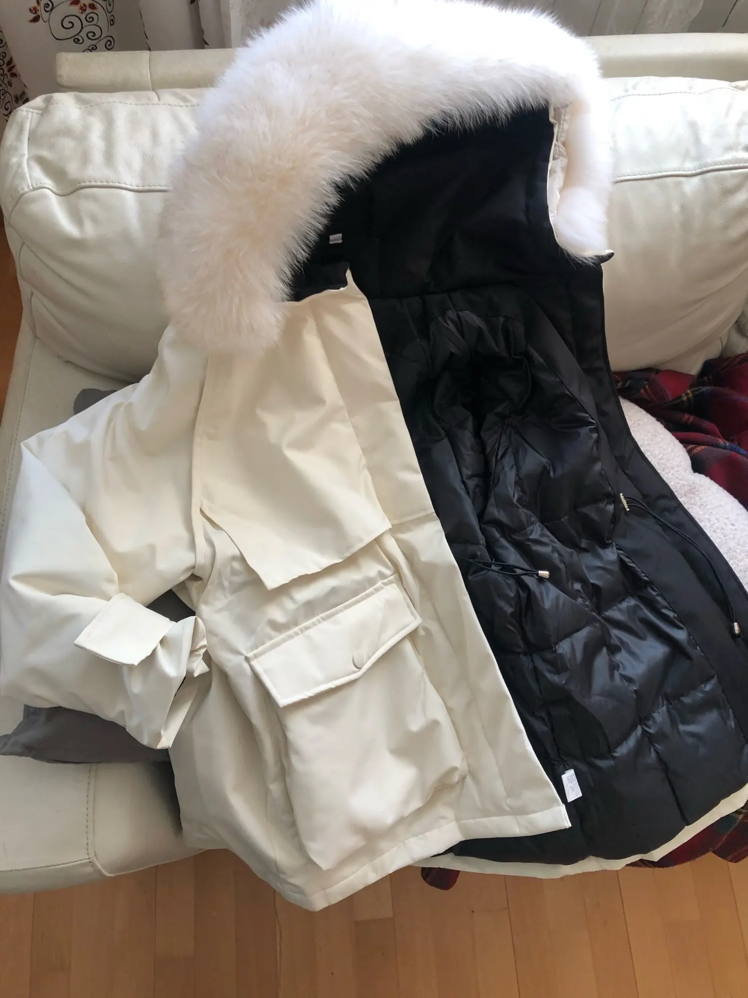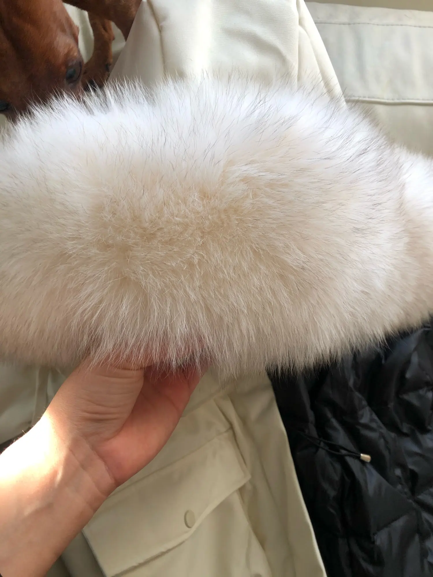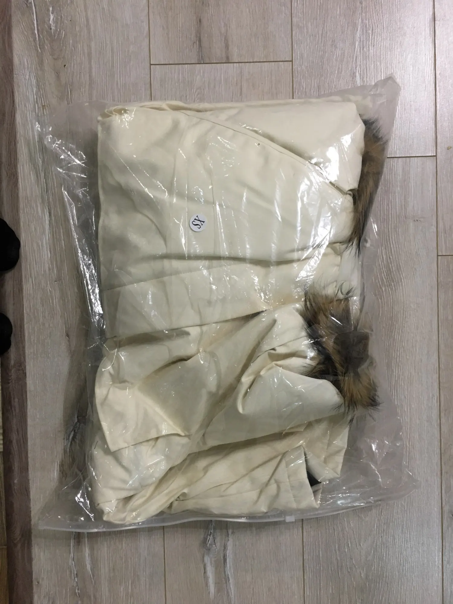 The jacket came two weeks before the Tyumen region Tracked. Fur fluffy natural, clings to buttons. On my height 158 cm, weight 47, 83-60-88 size XS just, straight as it should, shoulders on the ground, if the kuliska at the waist will free up look like an oversize. I feel like a doll in it. To-10, provided that from below you will blow the breeze, because it's like a platisko. The fabric is dense, the membrane. Ivory color. The hood is large, I drowned in it, and a little confused here is not integrity, in the photo it is visible, how the fur looks separate from the hood. And so very satisfied!