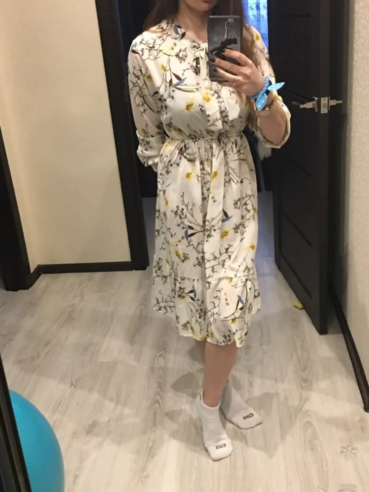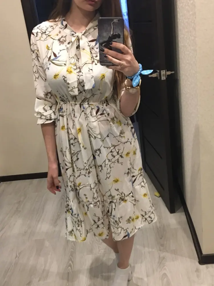 Chiffon High Elastic Waist Party Dress Bow A-line Women Full Sleeve Flower Print Floral Bohemian Dress Female Vestido with Plus Size Options