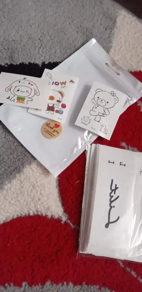 Package Includes 56 Sheets User Guide: 1.Cut out the tattoo of choice and remove the clear sheet. 2.Place tattoo face down on skin. 3.Wet the tattoo thoroughly with a sponge. 4.After 20-30 seconds, gently remove the backing paper. 5.Allow the tattoo to dry. How To Remove: 1.Dab tattoo with rubbing alcohol or baby oil. 2.Wait 10 seconds, then rub gently and repeatedly with more until removed.
