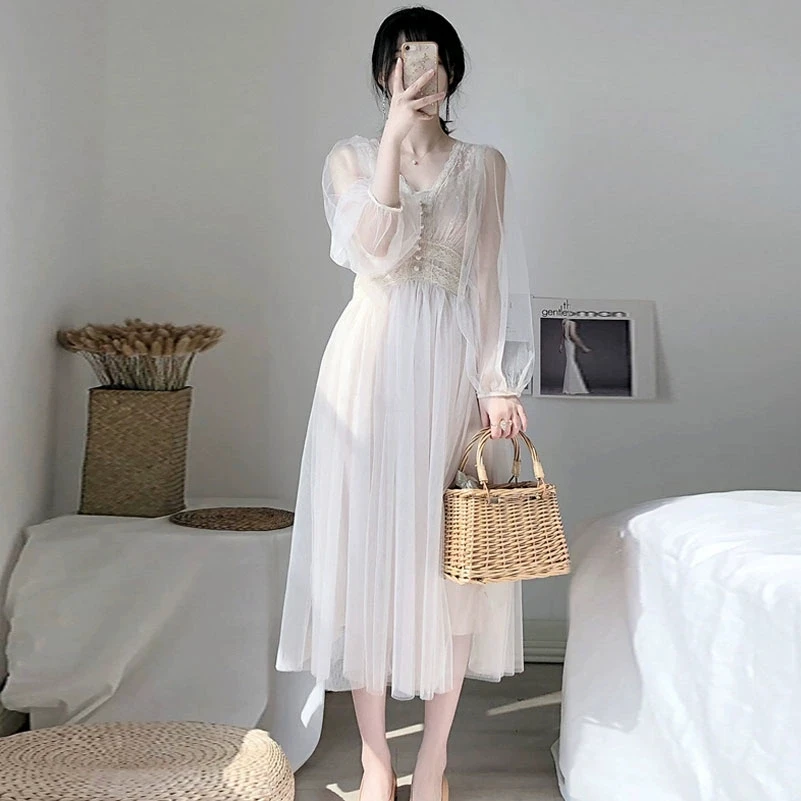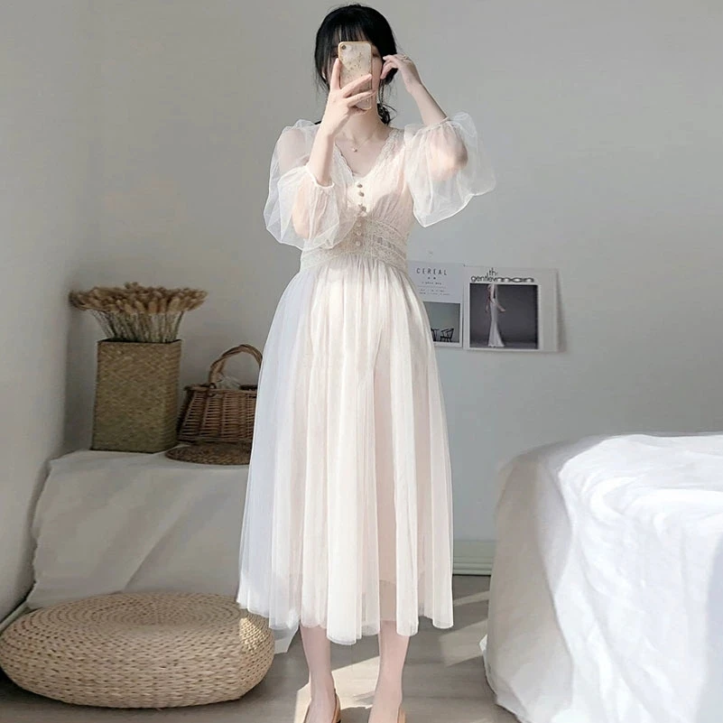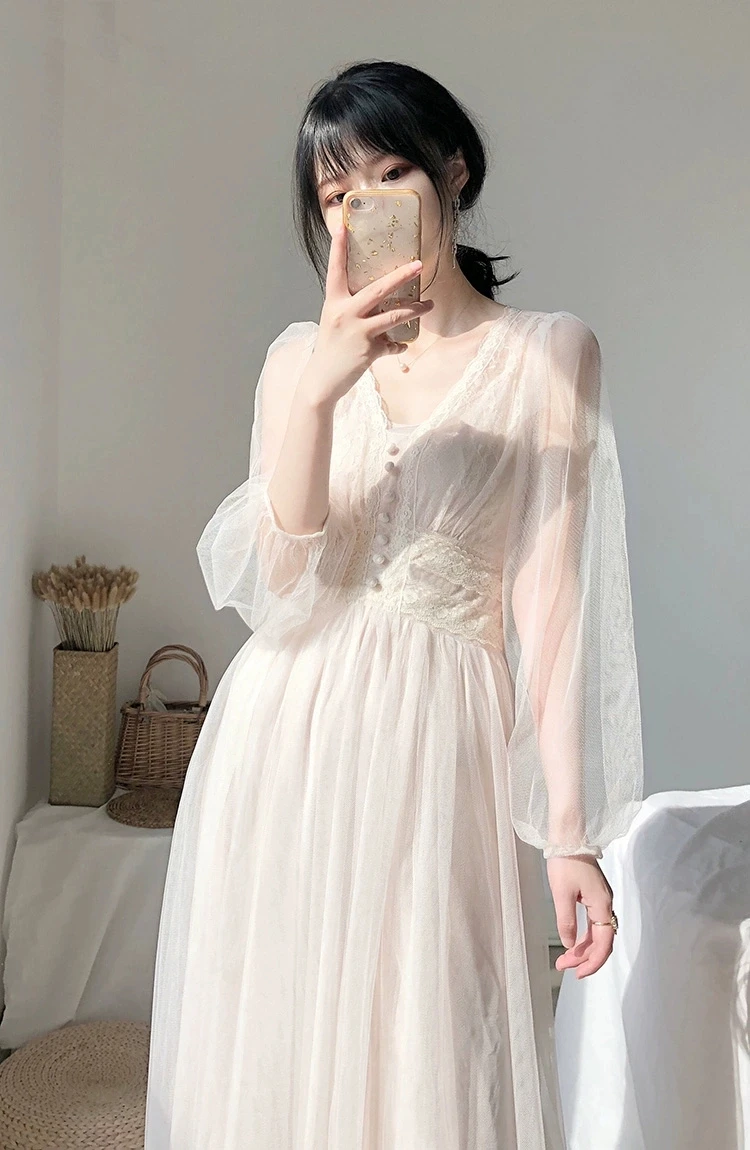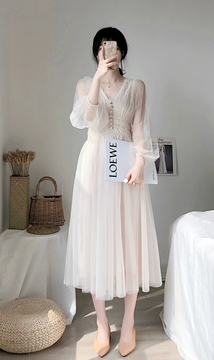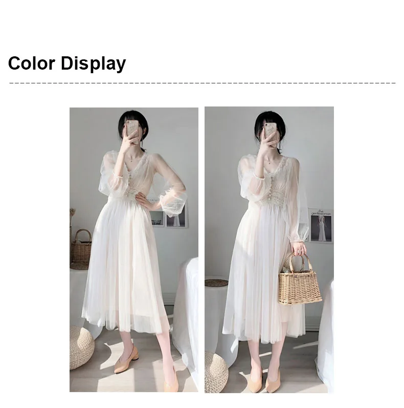 Women's Vintage Long Sleeve Ruffled Chiffon Dress, Beach Dress for Spring and Summer