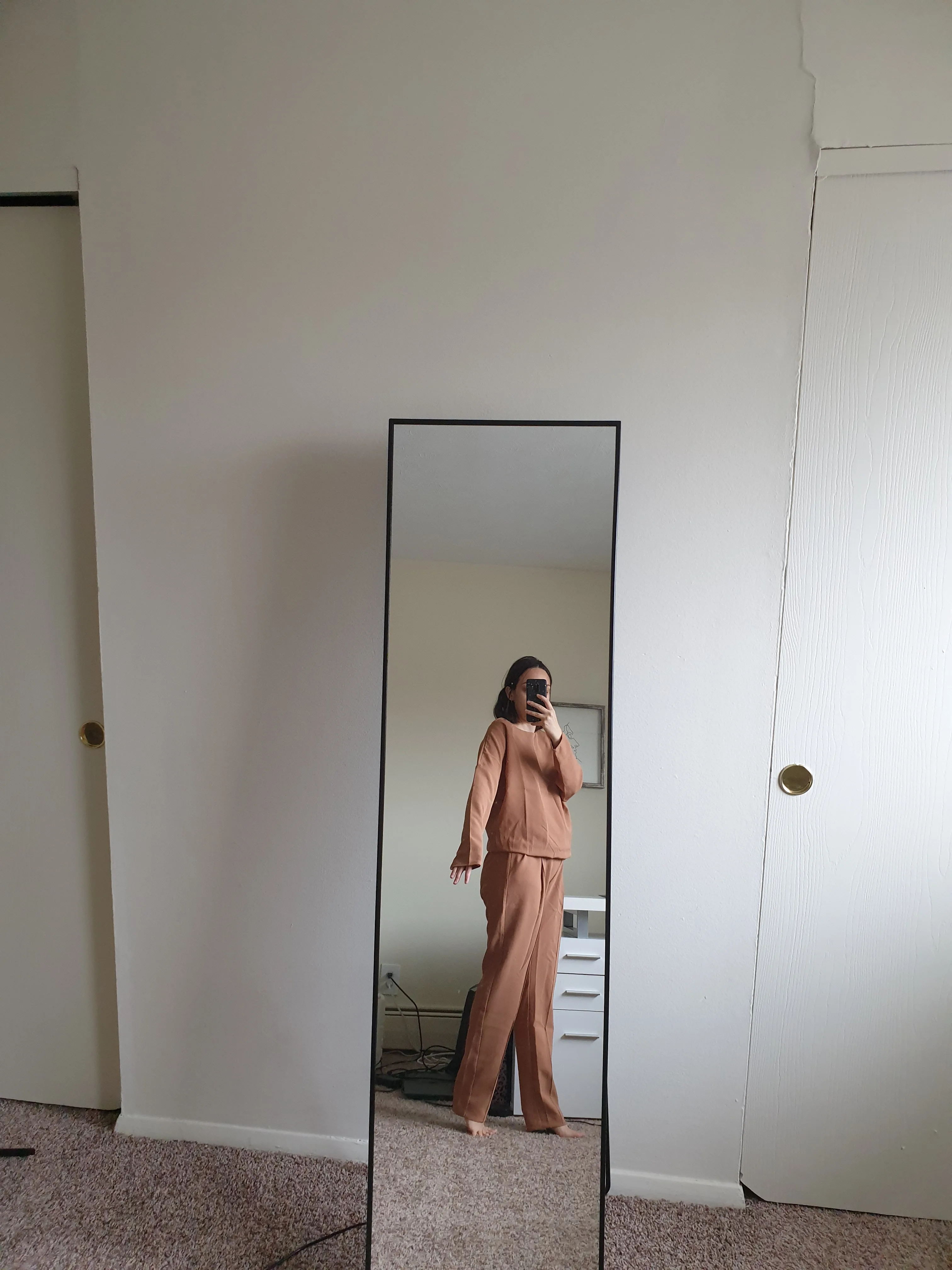 Quality is excellent!!! Height 156, about 106, from 78. I took pants and top, trousers L and top M. The whole village is perfect. Pants are a little long (but this is my eternal problem with such growth))) I think, in these pants will fit and with about 110. Cloth is dense, does not shine through. Threads do not stick out, there is no smell. It was longer for a month than stated, but the track was tracked. Very satisfied with the purchase!!! Recommend!!!