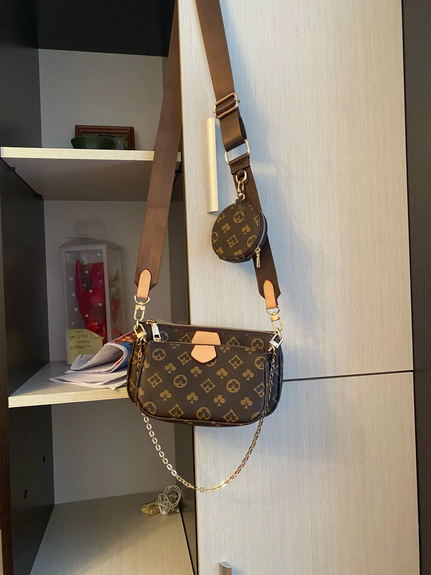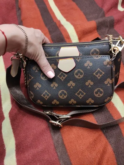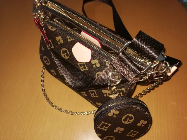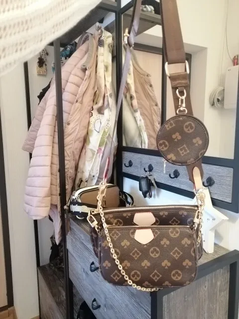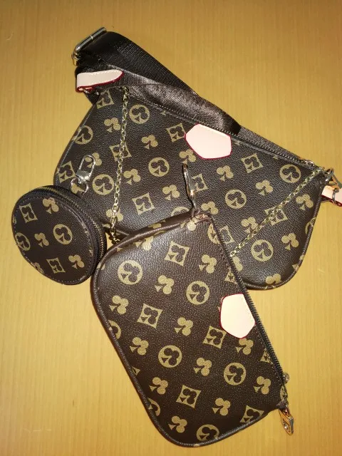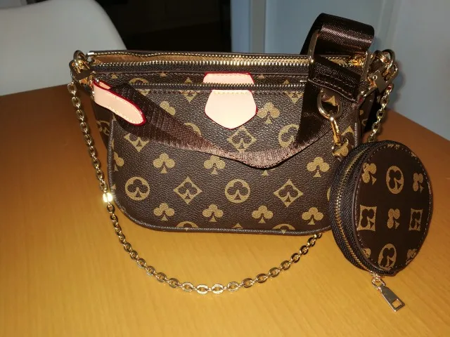 New 3-IN-1  Leather bag. It has a large strap, chain detailing, and a coin pouch. It can be used as a crossbody or shoulder bag.