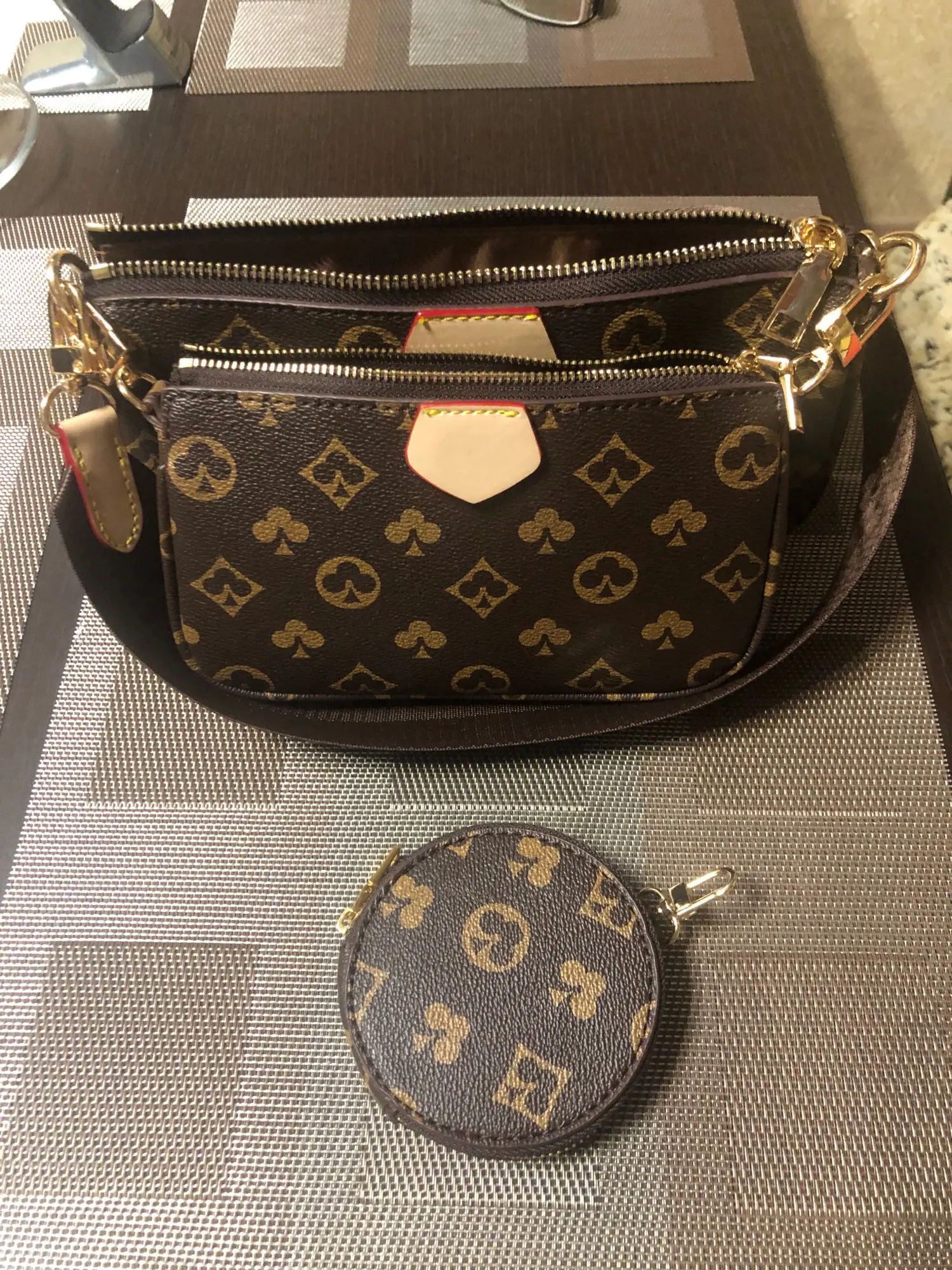Primary material: PU leather Lining Material: Polyester Interior: Cell phone pocket, Zipper pocket Closure type: zipper Size:24X13X3cm (Length x Height x Width) Package: 2x Bag, 1x Shoulder strap,1x wallet,1x Chain