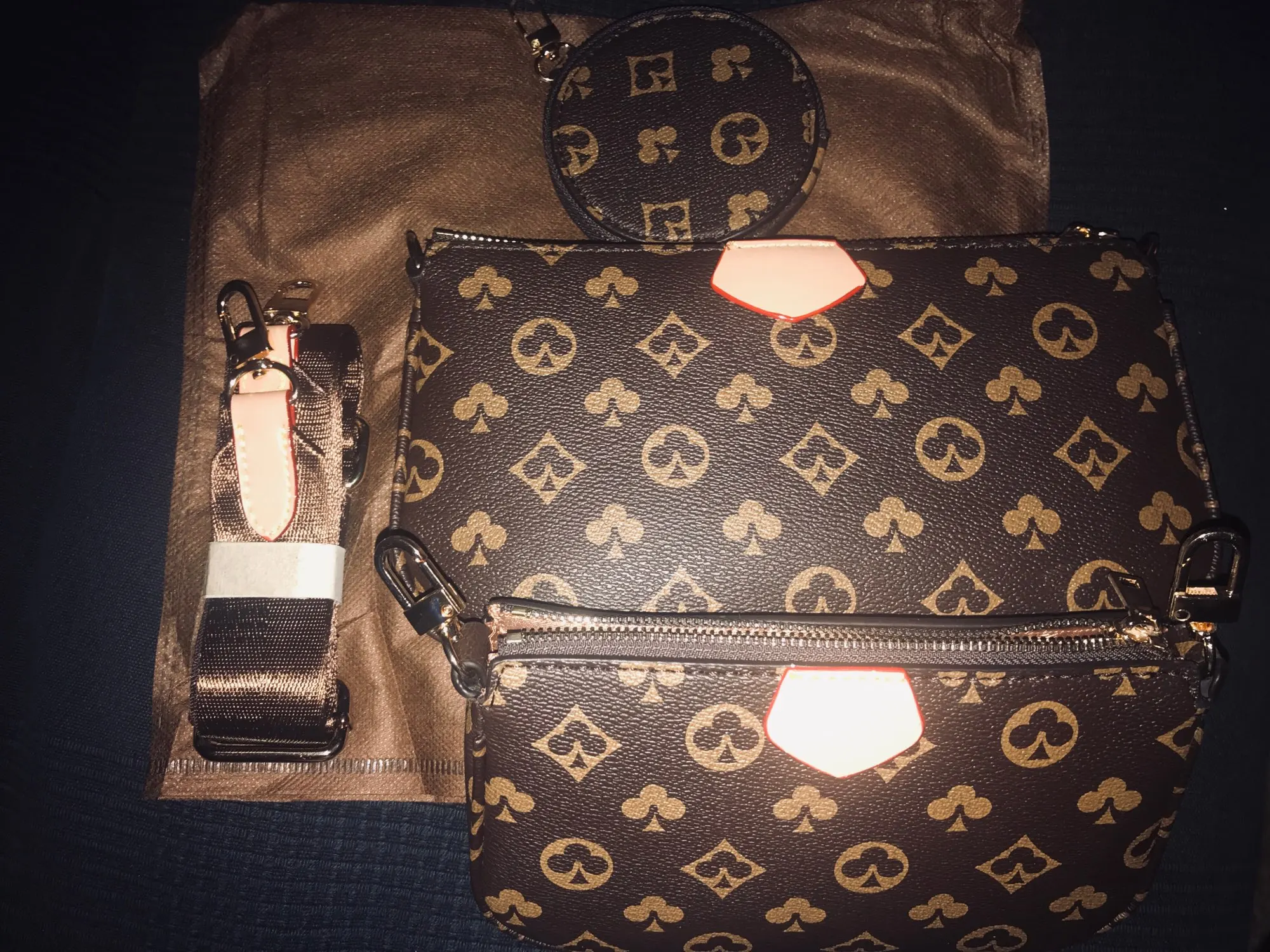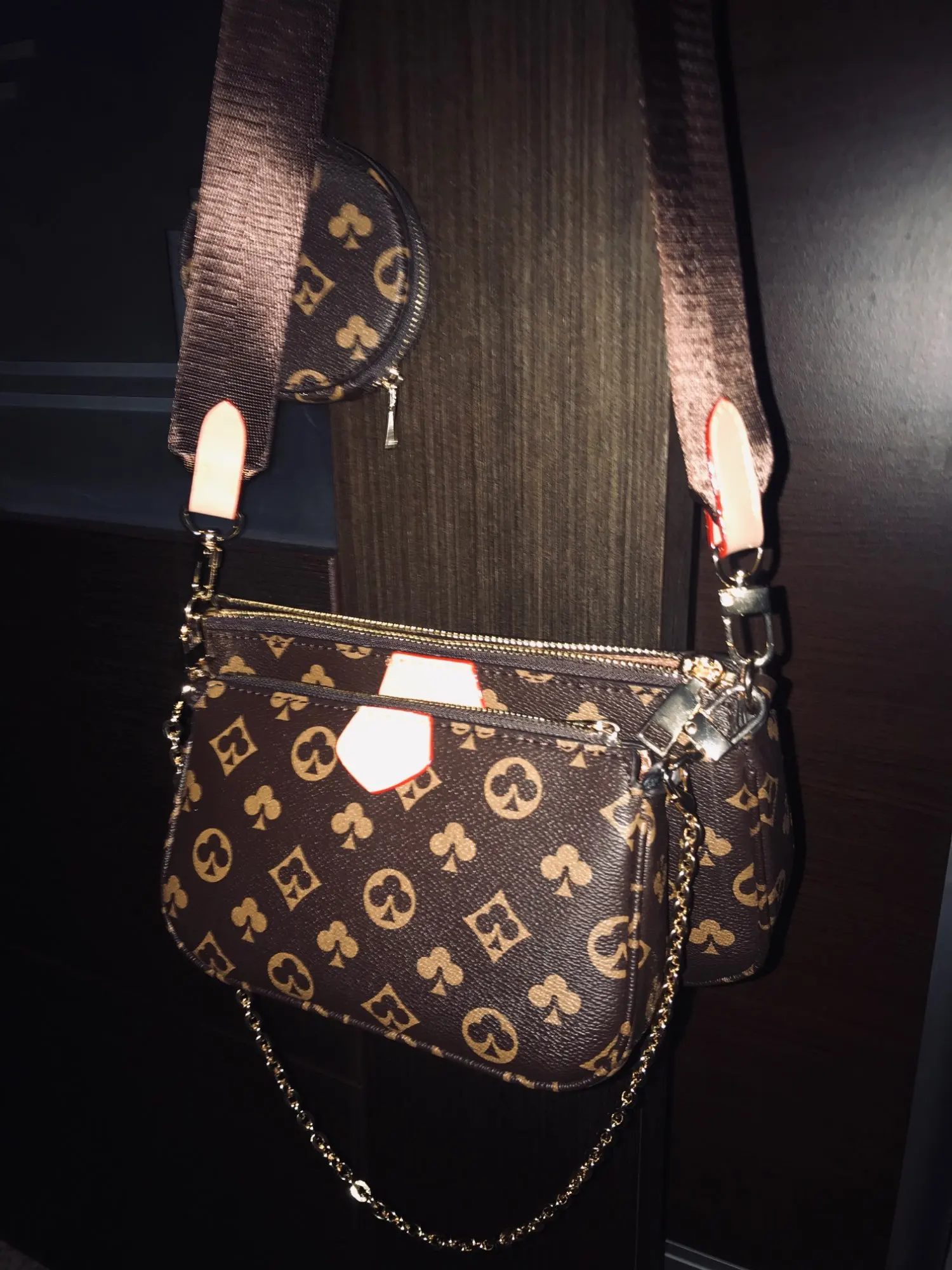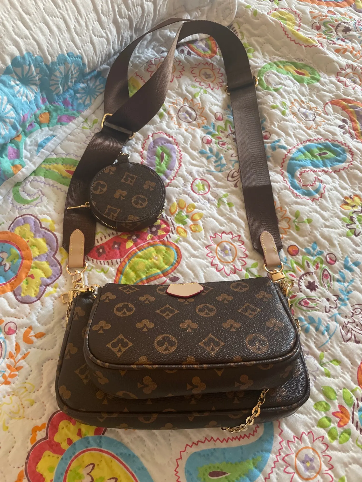 New 3-IN-1  Leather bag. It has a large strap, chain detailing, and a coin pouch. It can be used as a crossbody or shoulder bag.