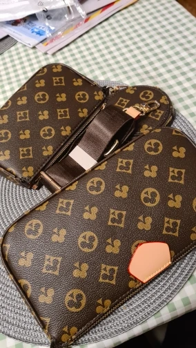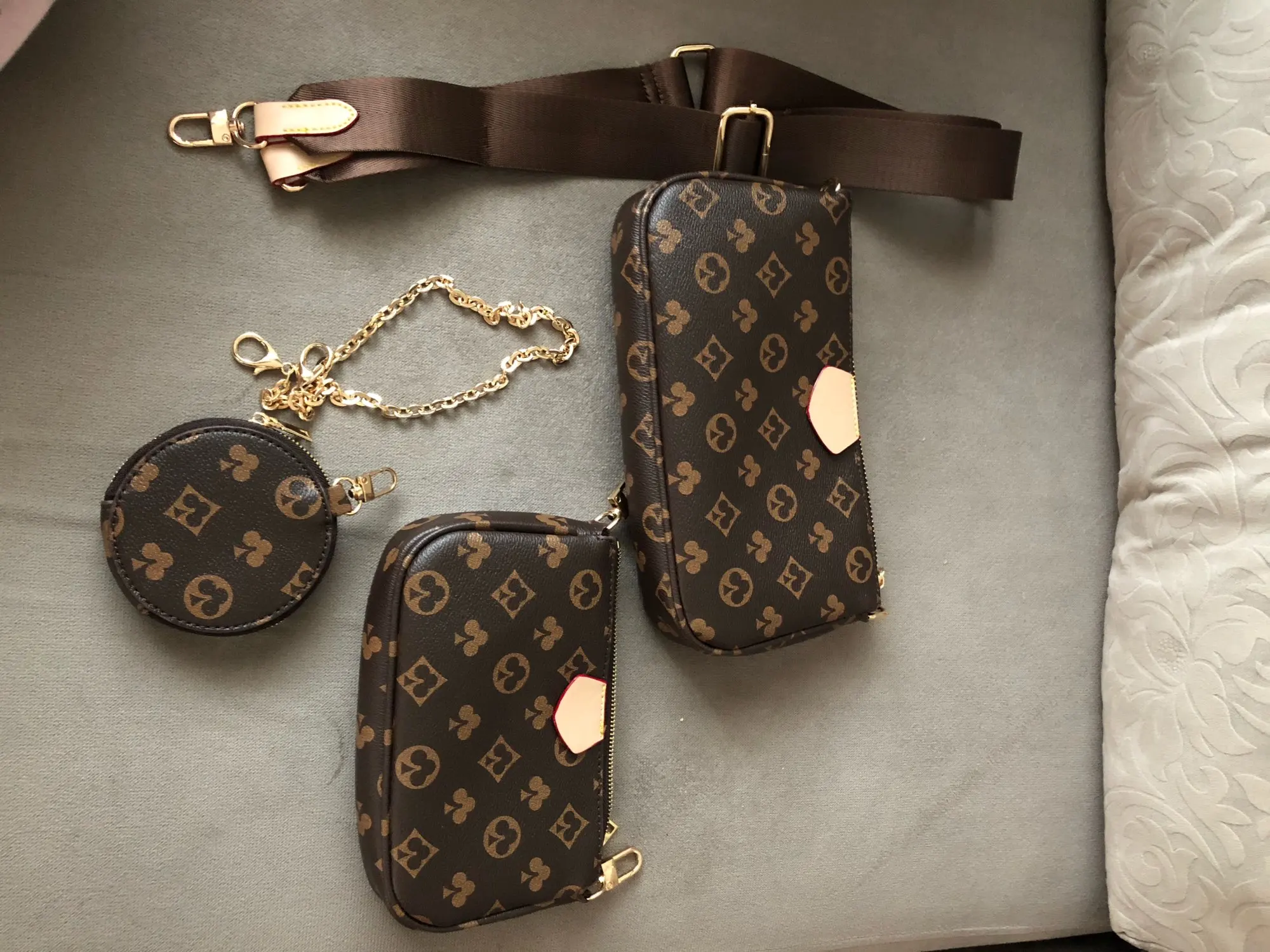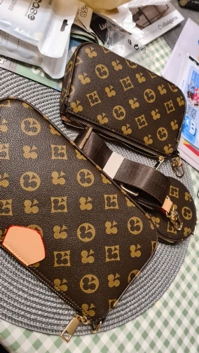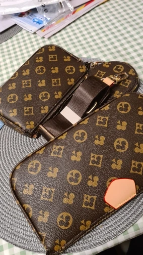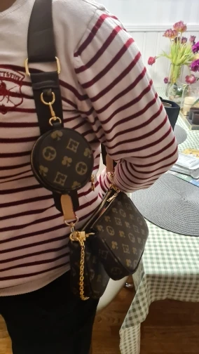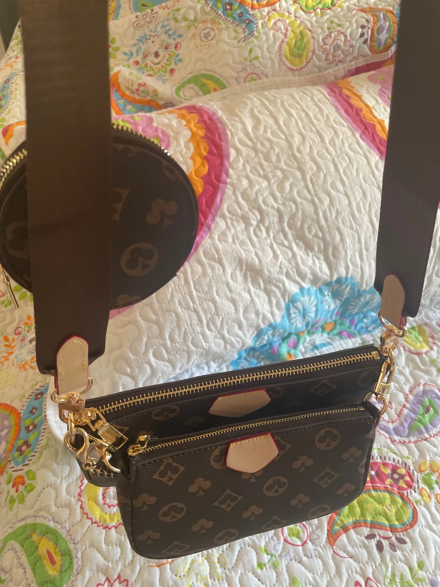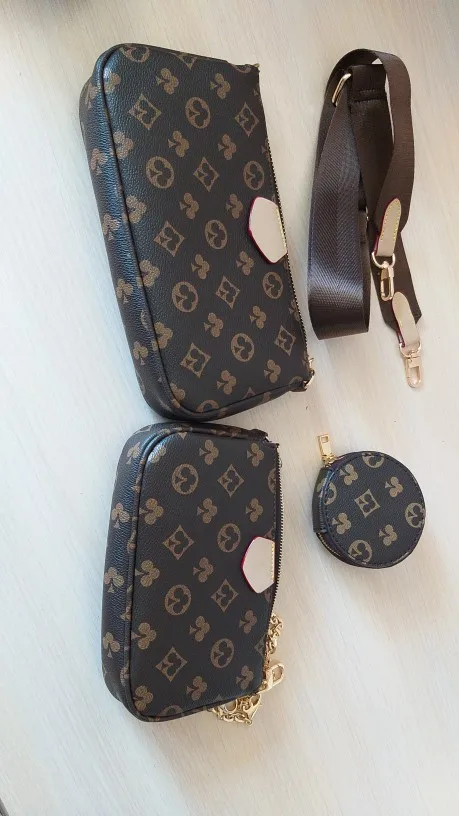 New 3-IN-1  Leather bag. It has a large strap, chain detailing, and a coin pouch. It can be used as a crossbody or shoulder bag.