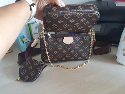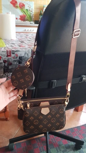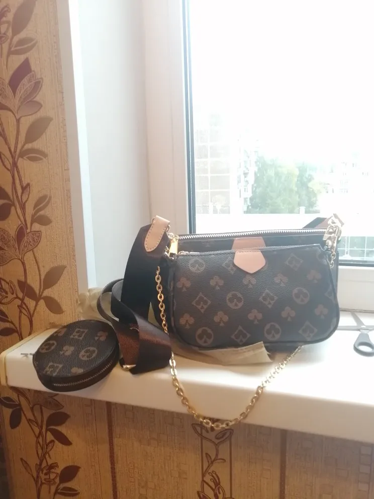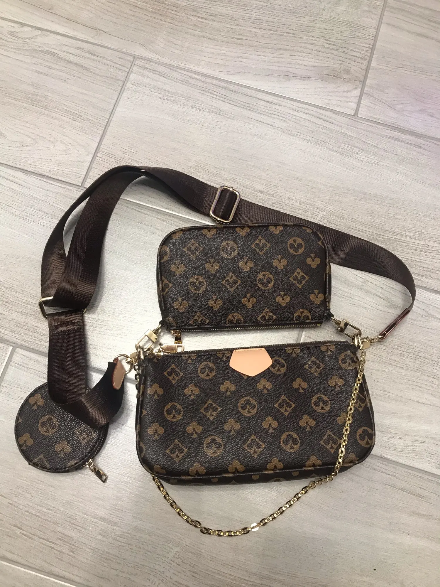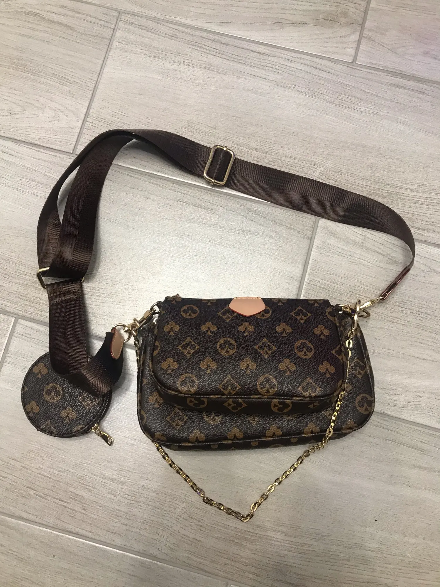 New 3-IN-1  Leather bag. It has a large strap, chain detailing, and a coin pouch. It can be used as a crossbody or shoulder bag.