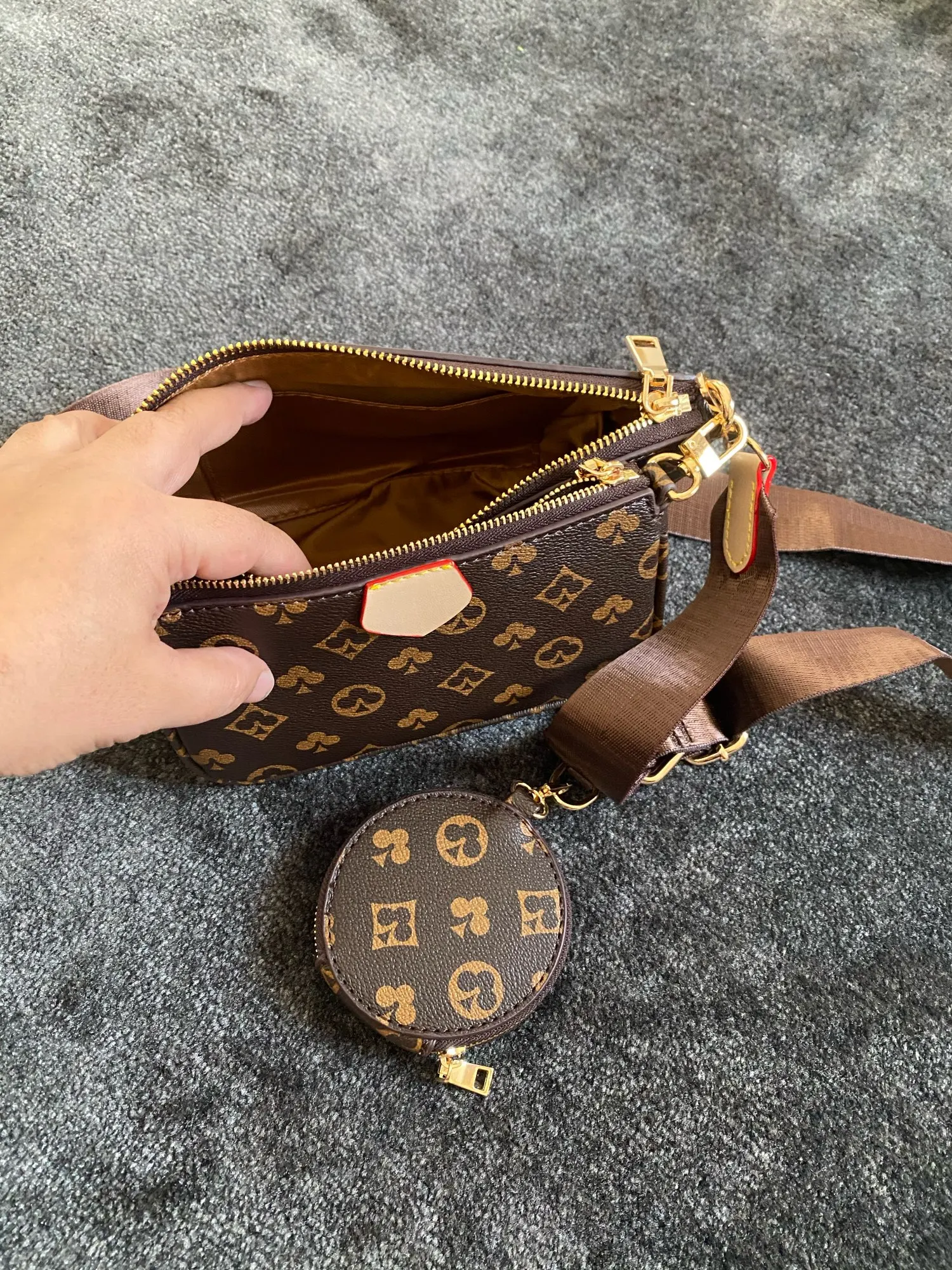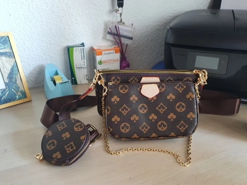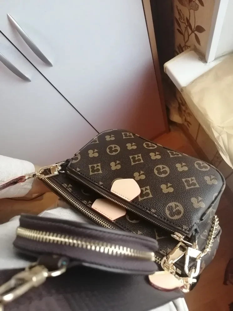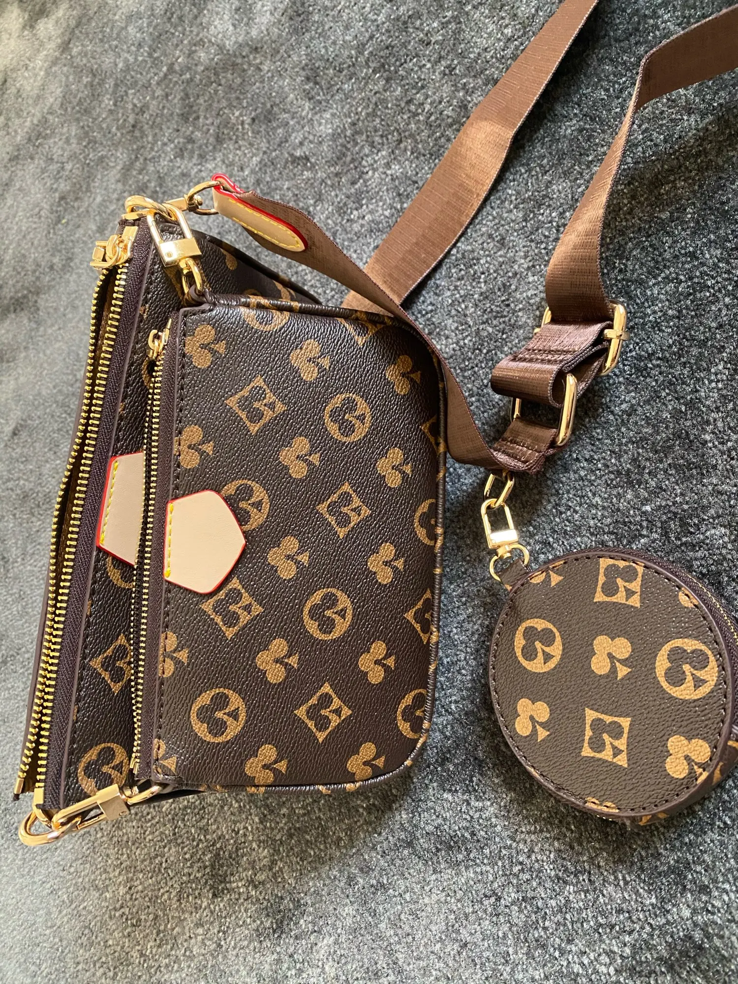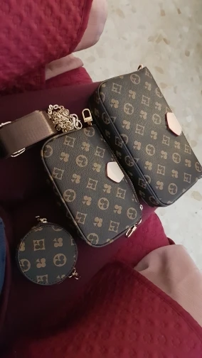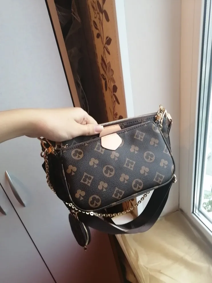 New 3-IN-1  Leather bag. It has a large strap, chain detailing, and a coin pouch. It can be used as a crossbody or shoulder bag.