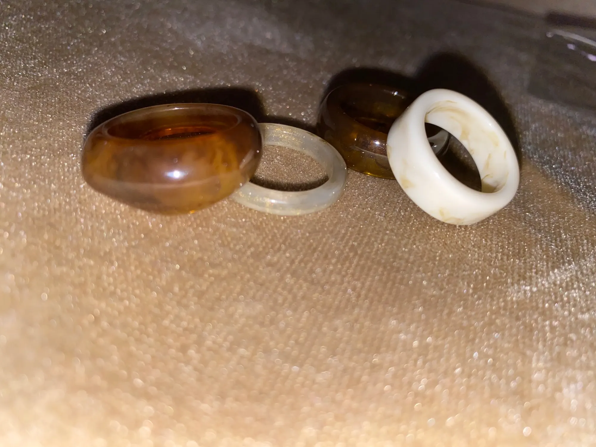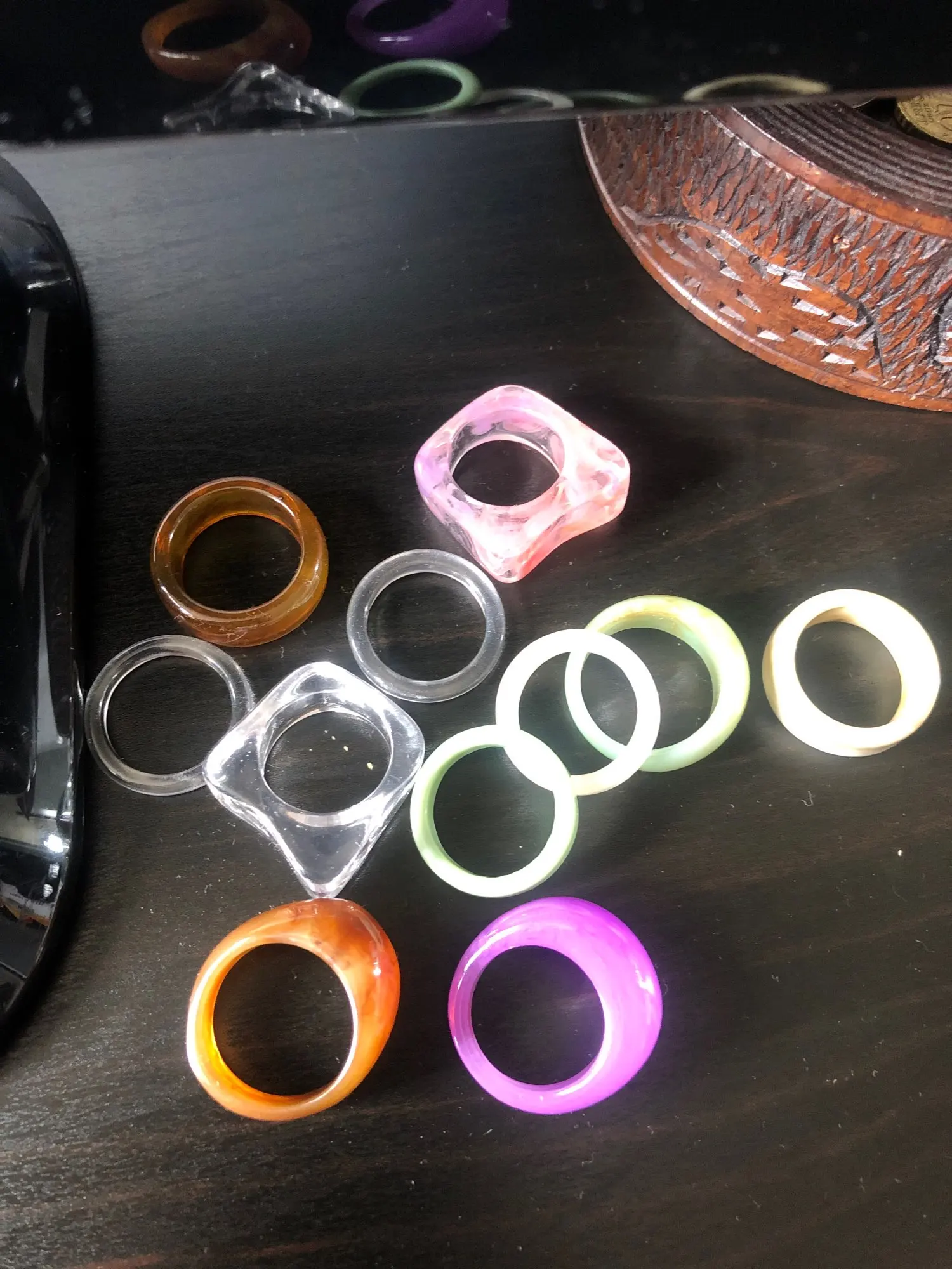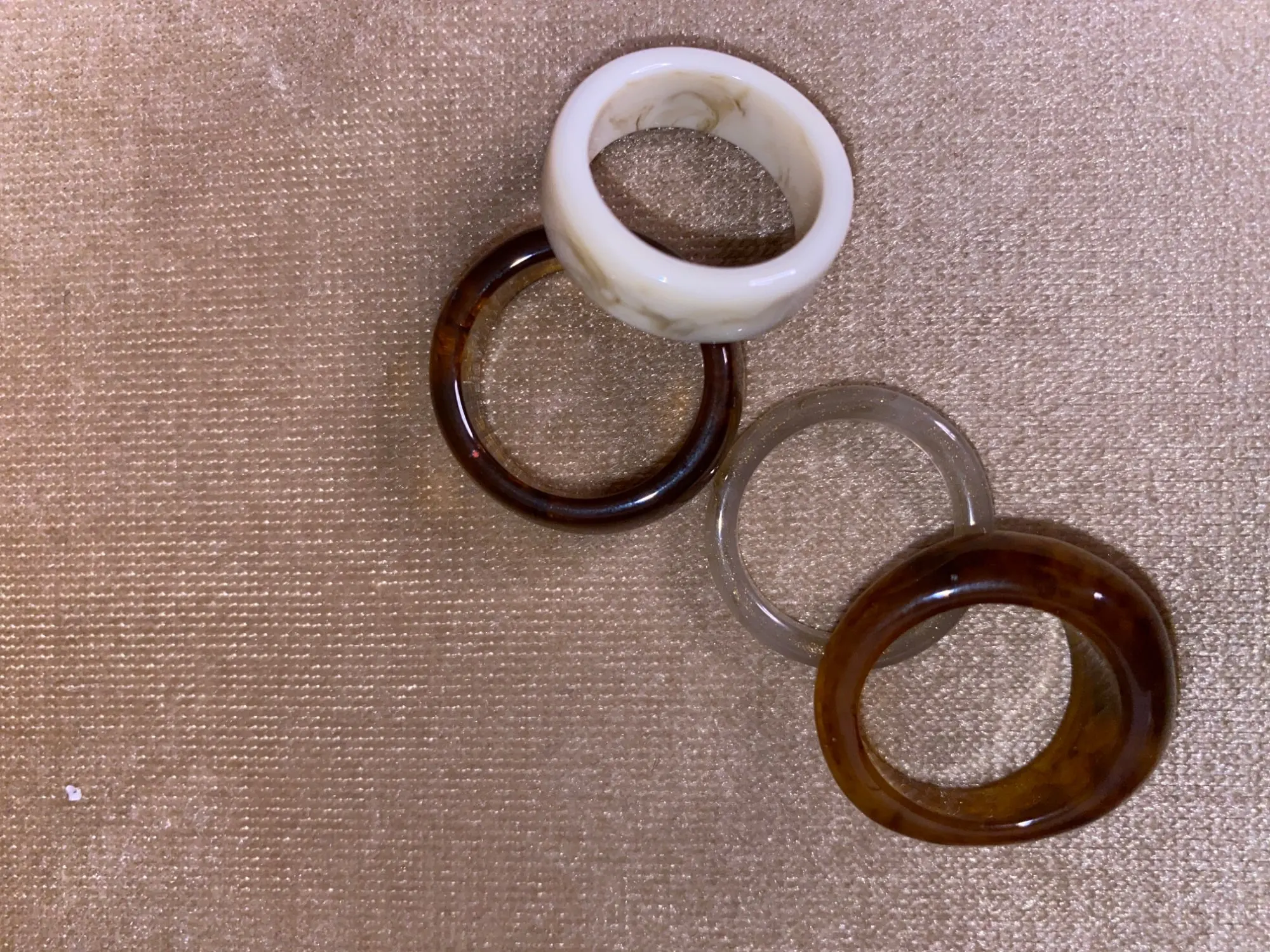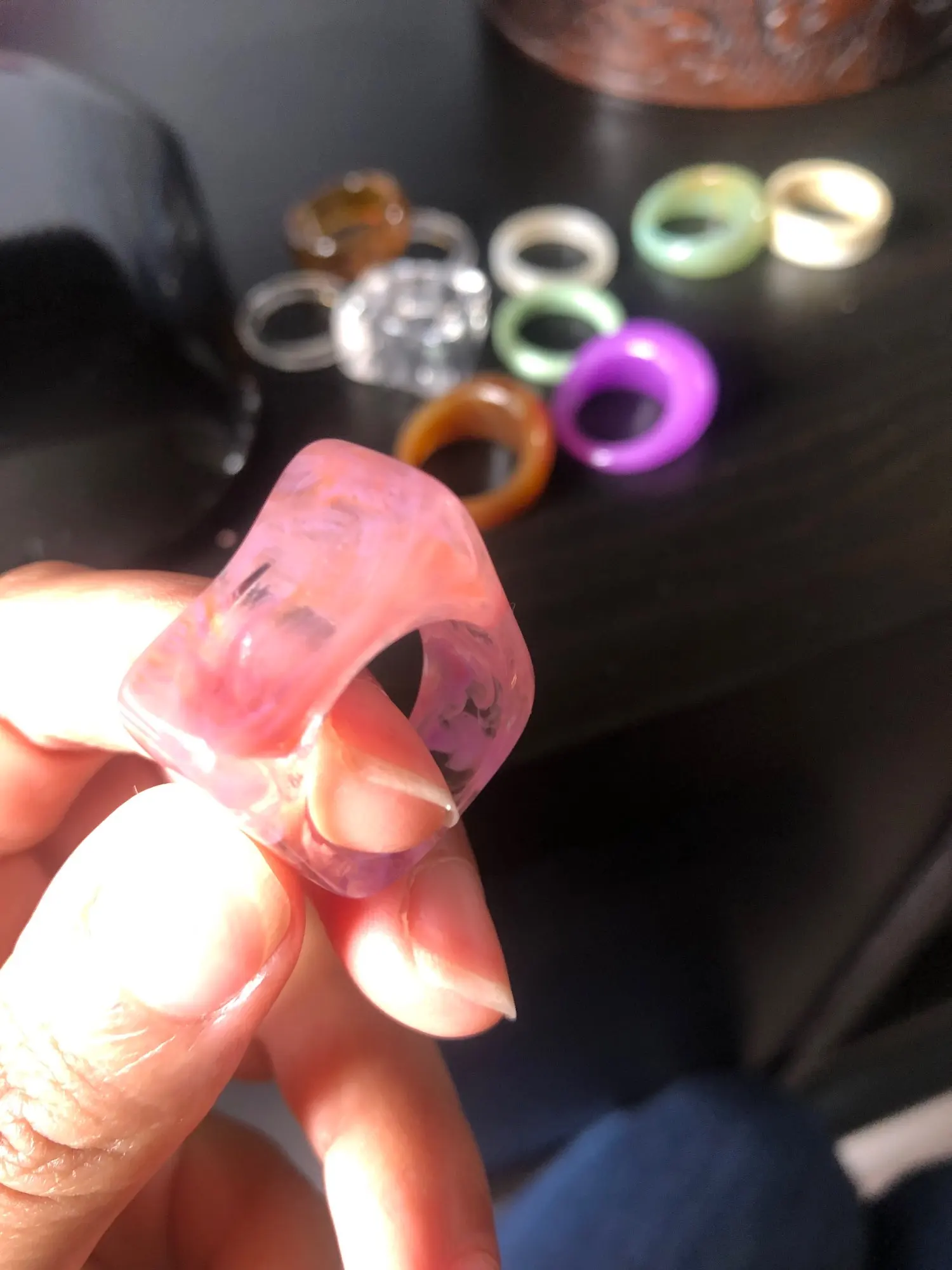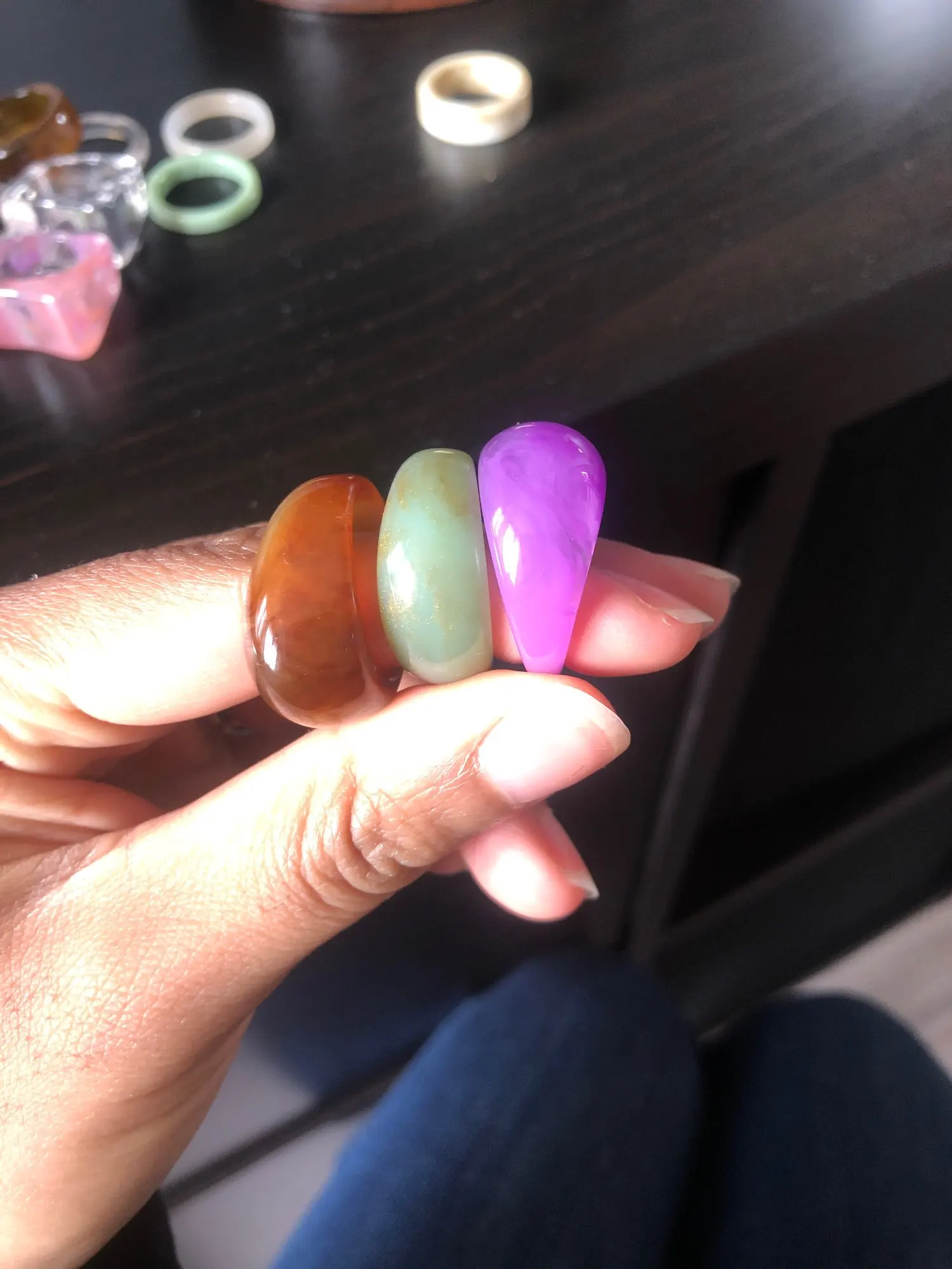 I liked beaucoupp the rings. It's serious style year 2000 the time of Charmed all that. After we feel that it's toc it's light after seeing the price it's sure it was not going to be Jade stone but in any case I'm very satisfied. Arrived much early than expected in 1 week and a half