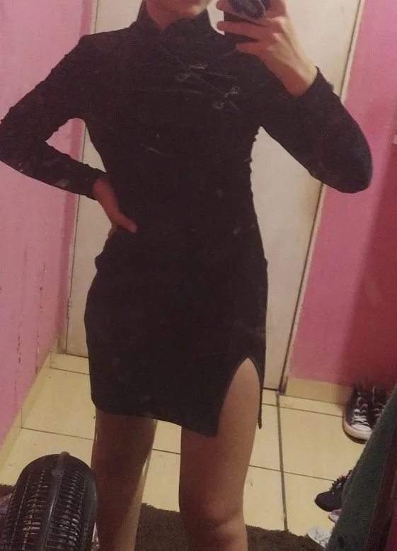Goth-inspired front slit dress is also a Chinese style bodycon mini sexy dress and can be used as a streetwear fashion, worn as a party dress, or paired up with leggings.