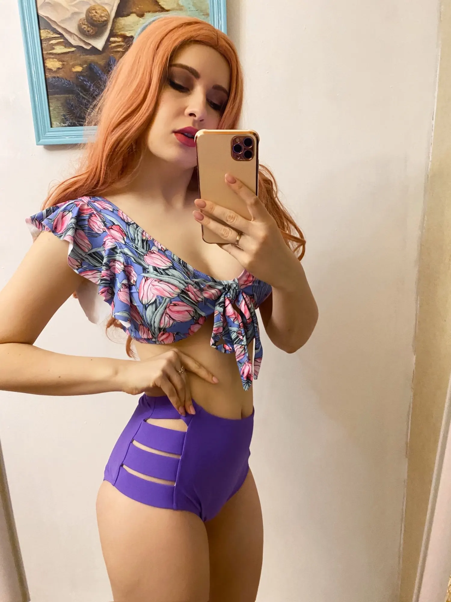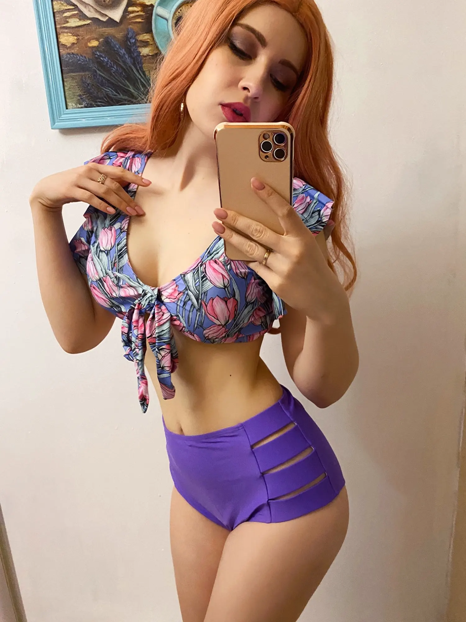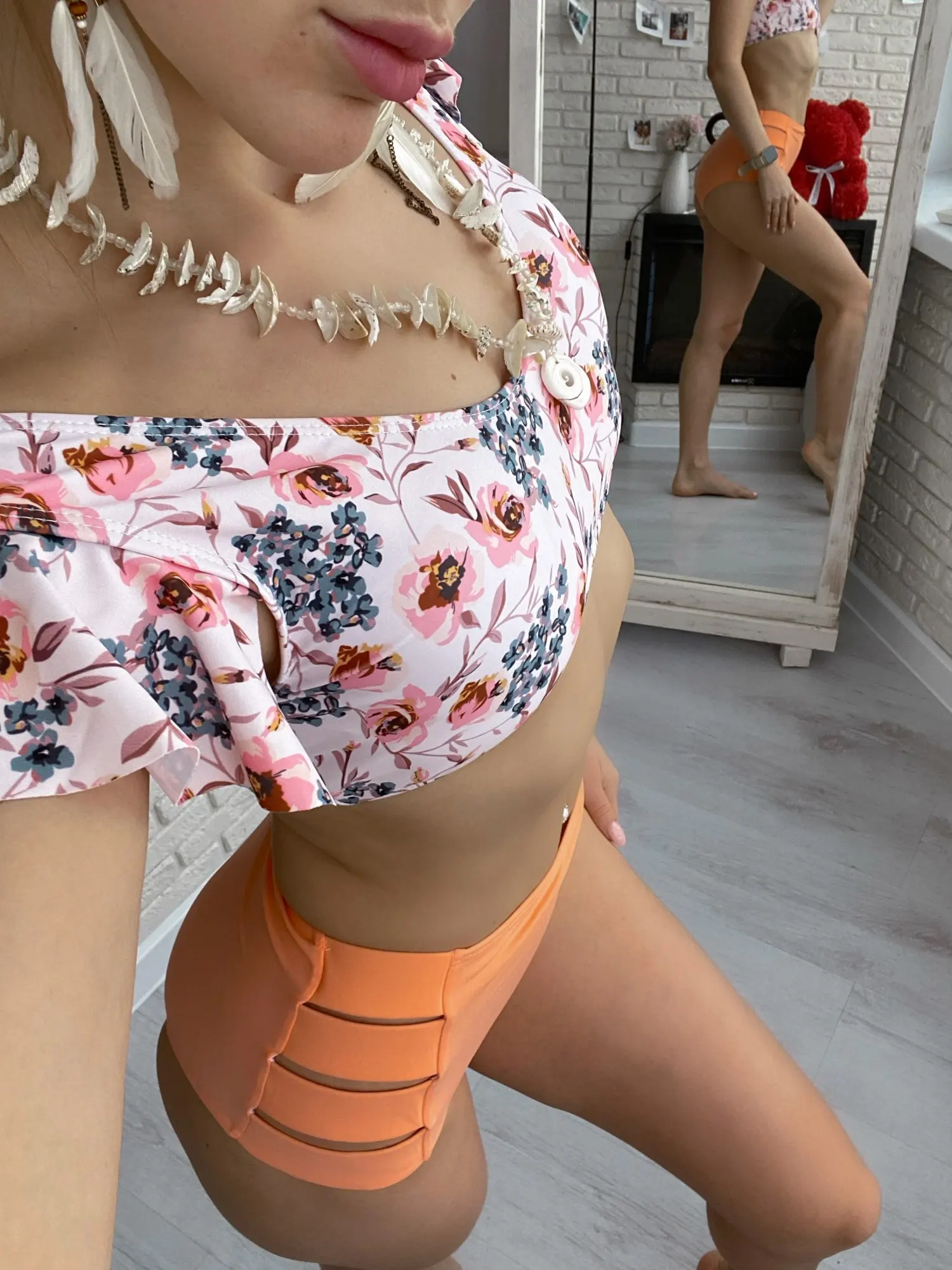 Very beautiful separate swimsuit, in a purple shade, the top of the swimsuit with a floral print, the fabric is bathing, it stretches well, in the chest there are inserts that can be be be the bottom of the swimsuit at the waist, on the sides are cuts, it will be very comfortable to swim, my parameters: height 175 cm, Chest volume 90 cm, waist 66 cm, hip Volume 97 cm, delivery super fast, quality is very good, recommend to buy)