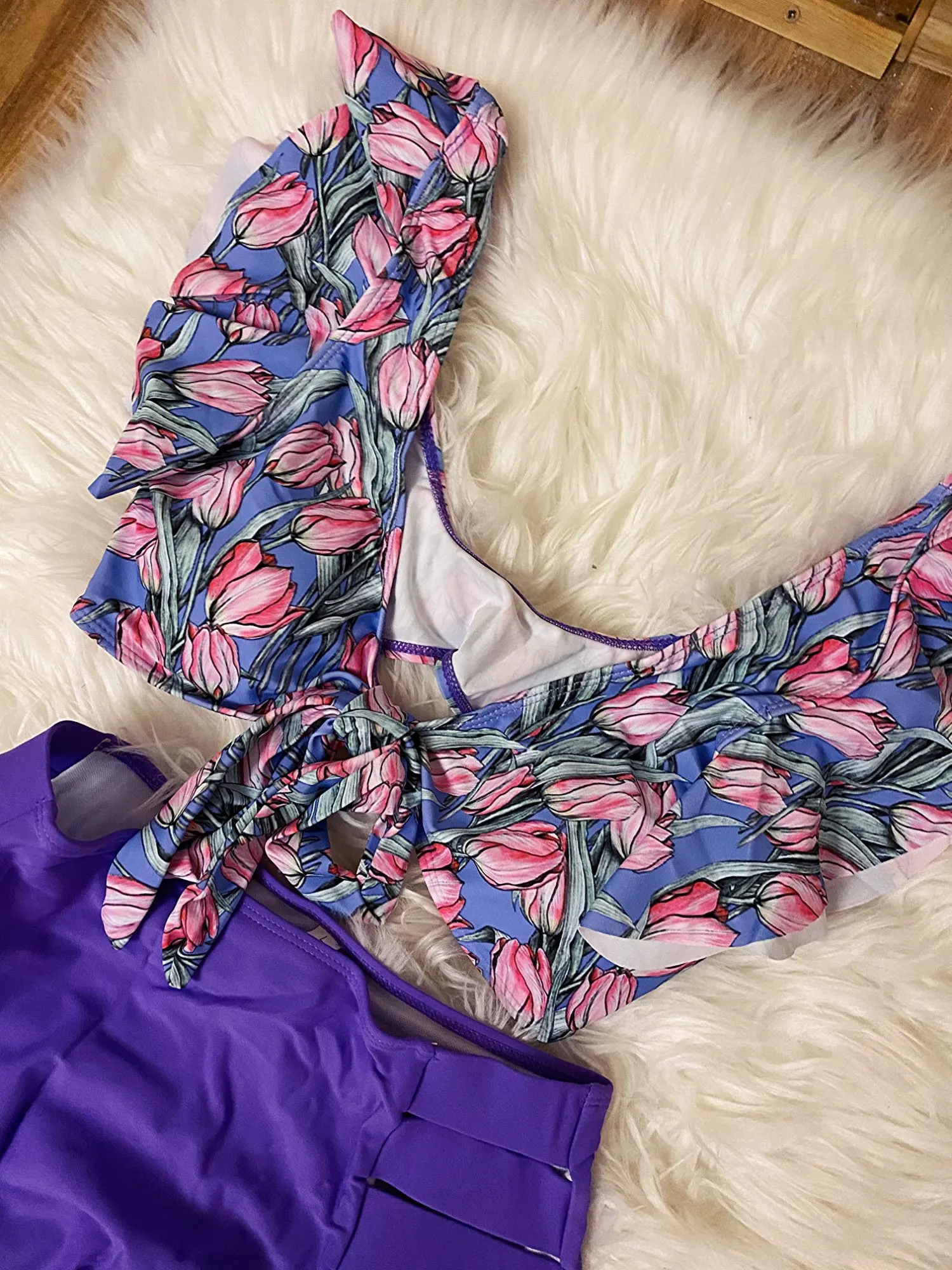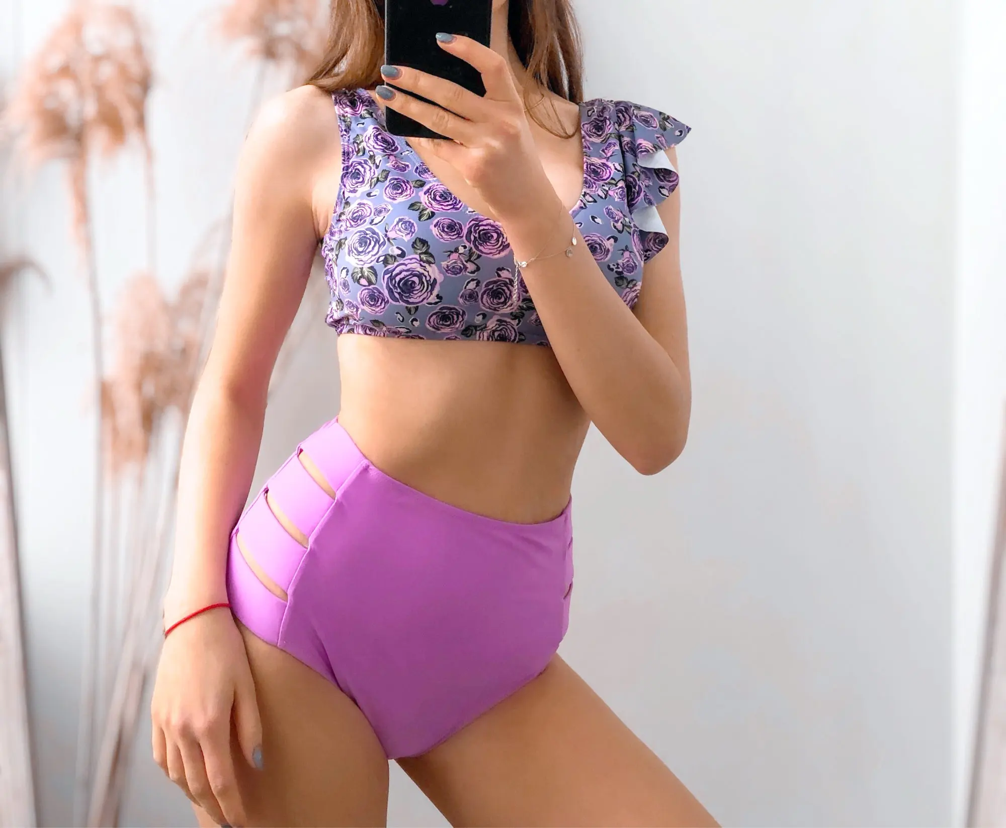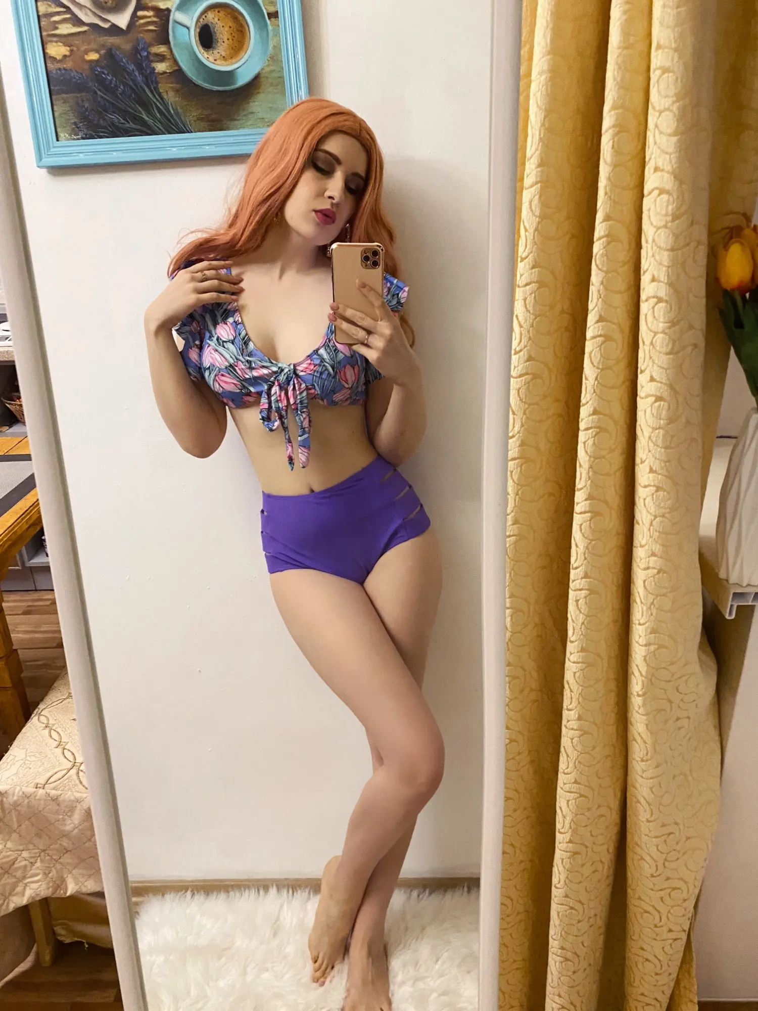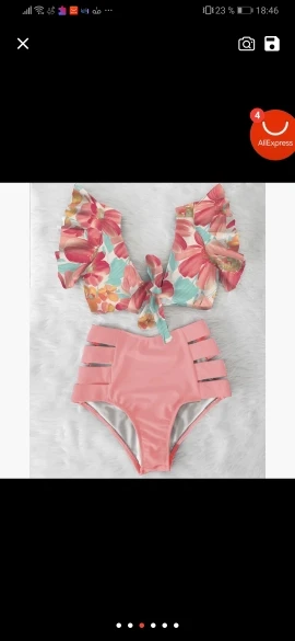Very beautiful separate swimsuit, in a purple shade, the top of the swimsuit with a floral print, the fabric is bathing, it stretches well, in the chest there are inserts that can be be be the bottom of the swimsuit at the waist, on the sides are cuts, it will be very comfortable to swim, my parameters: height 175 cm, Chest volume 90 cm, waist 66 cm, hip Volume 97 cm, delivery super fast, quality is very good, recommend to buy)