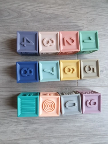 - Bright and beautiful colors. It satisfies the baby's preferences and attracts their attention. 2 x 2 x 2 inches (approximately 5.1 x 5.1 x 5.1 cm), very suitable for baby's small hands. Food-grade silicone, BPA-free, safe and non-toxic. - These blocks are super soft and easy to squeeze, suitable for children to play. When you squeeze them, it will squeak, which is the most interesting sound for babies. -The soft block is made of natural resin material, does not contain BPA, and is boiled at a high temperature of 100 ℃, without deformation and discoloration. Babies often chew when teething. This is a perfect chewing material. - It can float in the water when squeezed, and then spray water to let your baby play with building blocks in the shower. Let your little baby fall in love with the shower. - There are figures, animals and embossed textures on each side. This is also a matching game. Provide children with endless fun and encourage children to build, balance, count, learn letters and other motor skills.