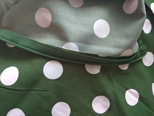 Lovely dress. Bright. Synthetics, but pleasant to the body.
