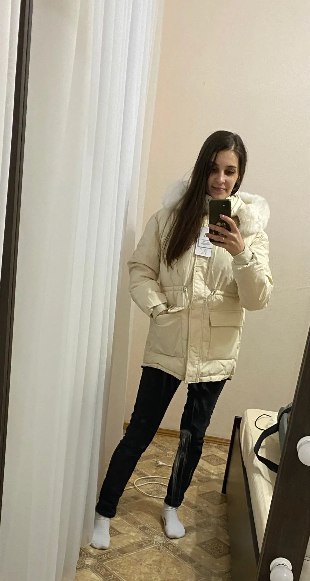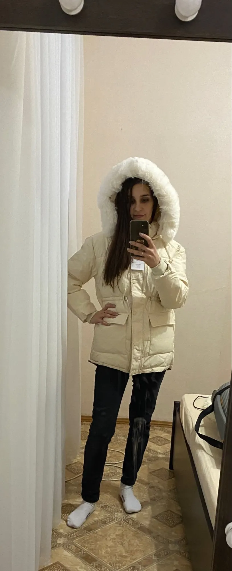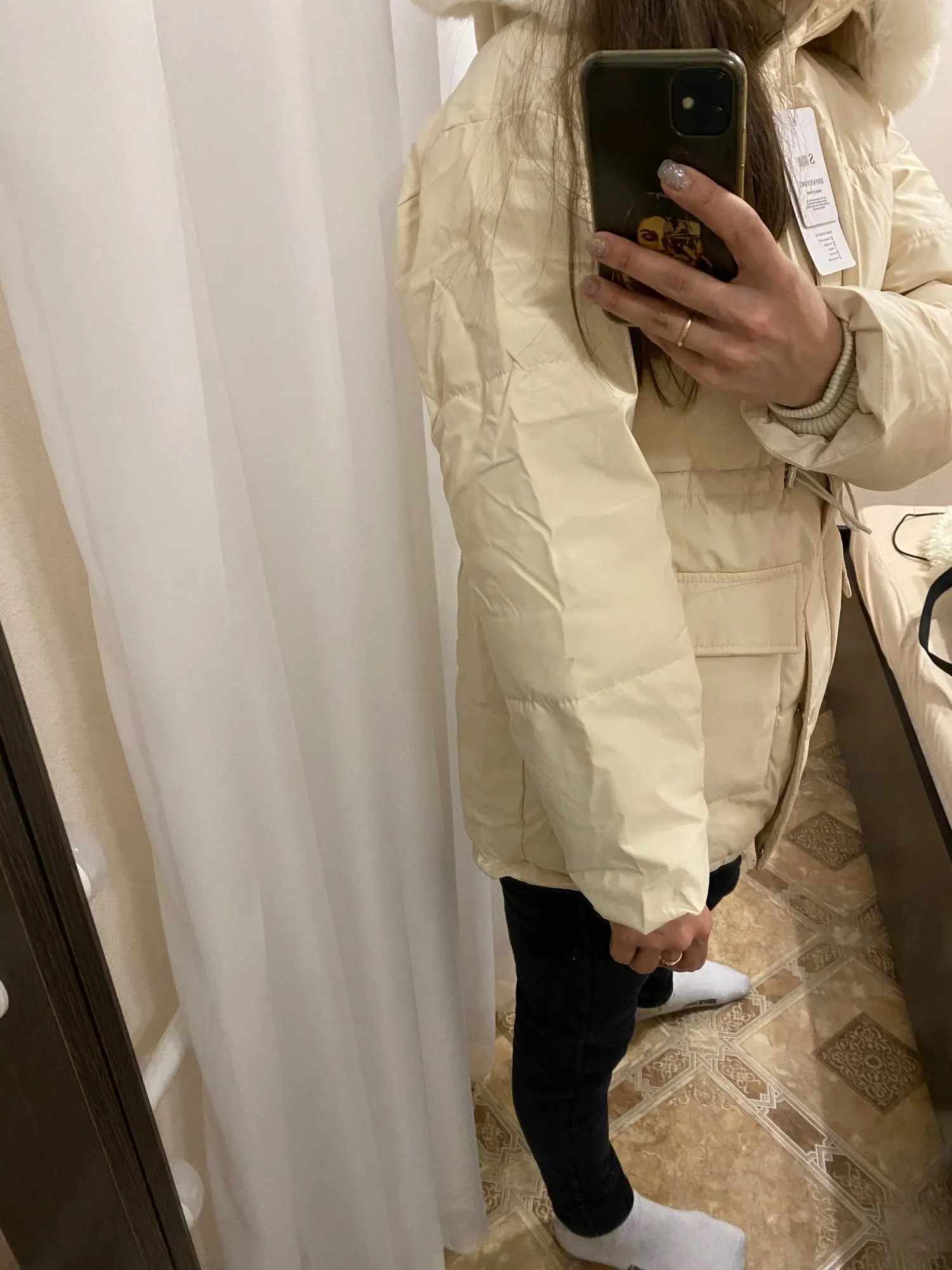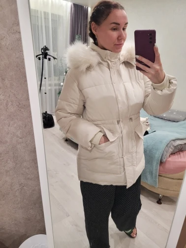 In appearance and quality cool down jacket, Frost has not yet checked)) on my parameters 90/66/90 and height 165 cm perfectly sits! Sleeve along the length of the norms. The edge is quite excellent, I will wear it with it.
