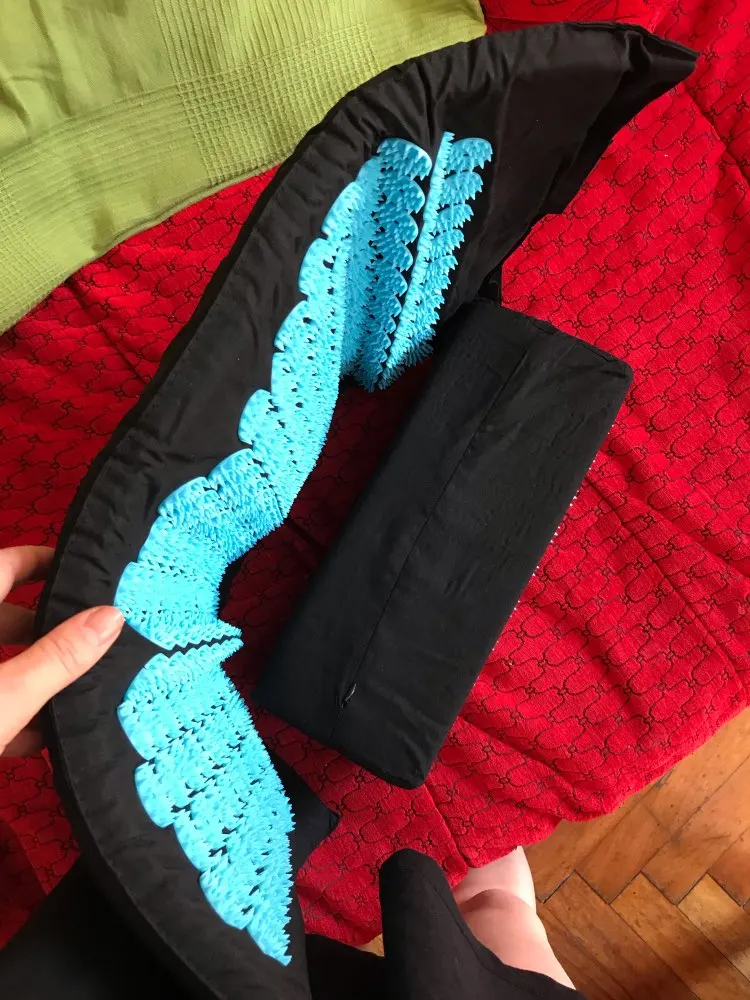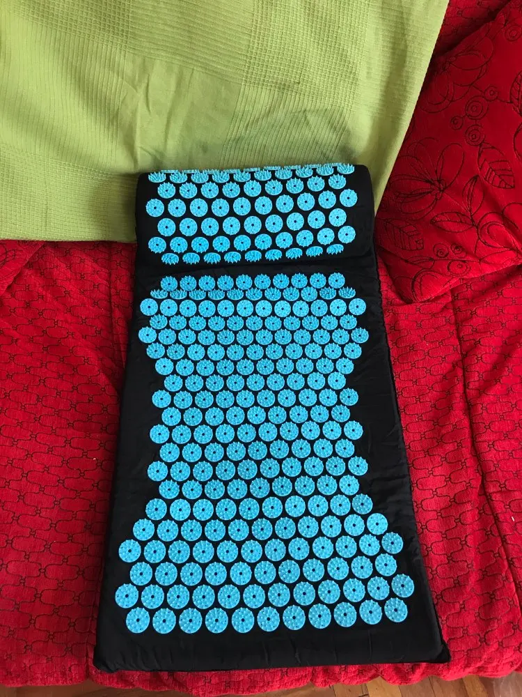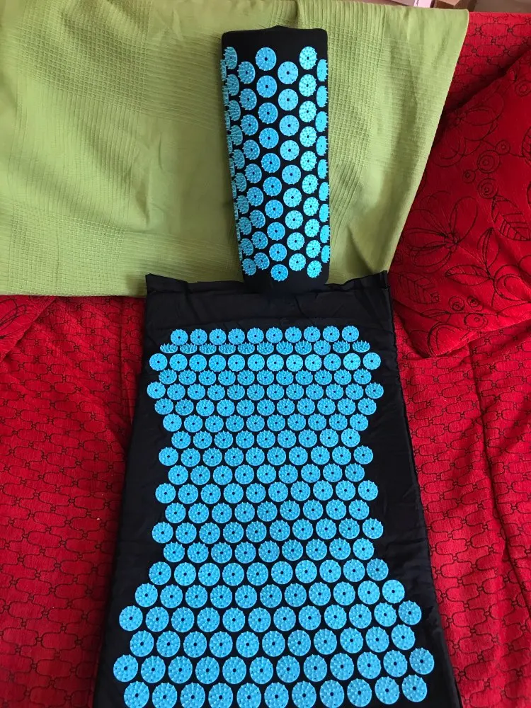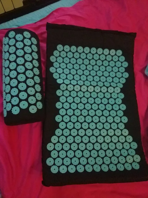 Specifications: Material:cotton+pvc+sponge Mat size:67*42*2cm Pillow size:37*15*10cm ABS buckle: Mat with 230pcs 27 needle buckle Pillow with 72pcs 27 needle buckle Color:black,green,blue,dark green,purple