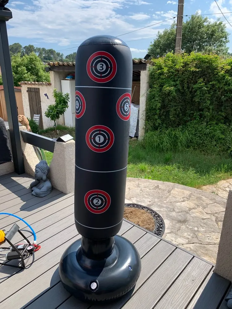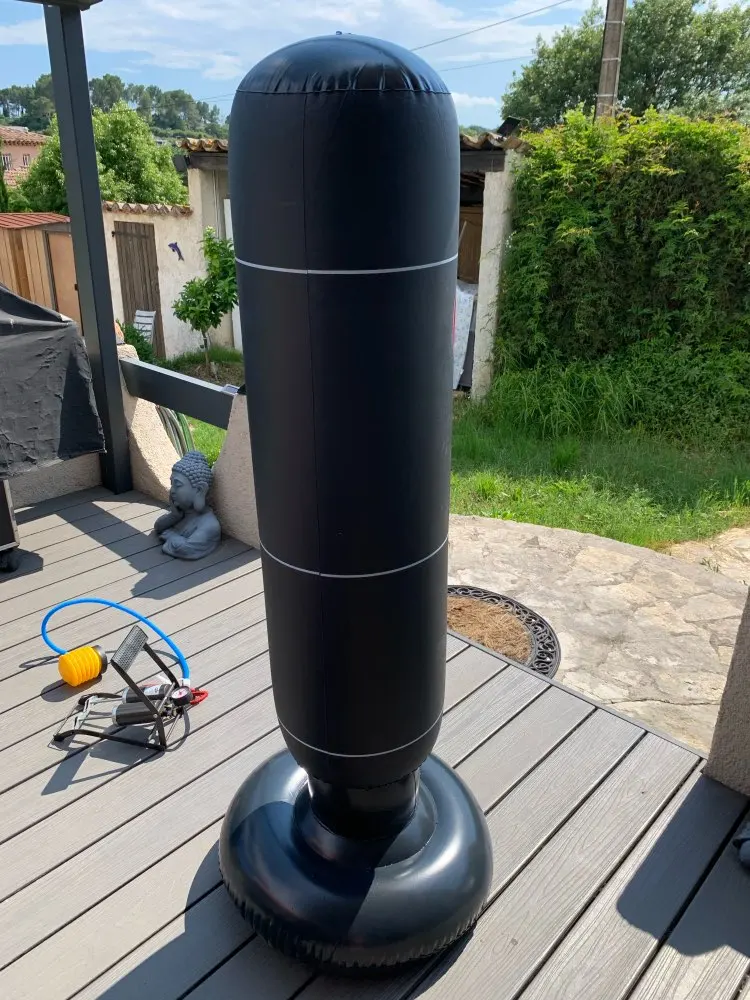 1. You can fill the bottom with sand or water (more than 7 kg) for stability. 2. Great For Exercise, Helping Increase Agility And Hand-Eye Coordination. 3. Inflatable Products Are Small, Light Weight, You Can Fold It And Put Into The Backpack Carry   Specifications: 1. Type: Inflatable Punch Tumbler 2. Material: PVC 3. Colour: Black 4. Age: > 6 Years 5. Size: About 160*30cm,Height 63 inches,diameter 11.81 inches 6. Weight: About 1kg 7. Suitable: 1.5M-for kids/teenagers(height<1.6M) 1.6M-for teenagers/adults(height>=1.6M)   Notice and Function 1. The product is made of quality PVC material, lightweight and durable, the bottom has thickened design, suitable for both indoor and outdoor use. 2. It has two compartments, the bottom one is for water or sand to increase the weight to keep it stand stable on the ground, the upper is for air to help you train your skills. 3. Easy to inflate and deflate, can be folded into small size for storage. 4. Good for relieving pressure, bodybuilding, etc. 5. The product has a smell that is normal, you can put it in a place where the air is circulated for a while.