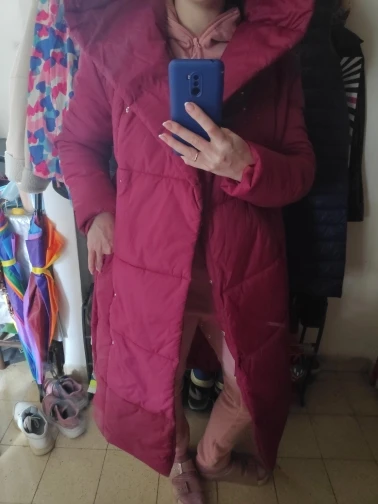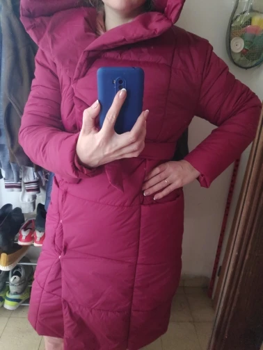 Super jacket, long as a coat, very pleasant, sewn well, nothing superfluous, no stickers and emblems, on the buttons, sits perfectly, I liked the color. Inside it looks like a sintepon, very warm, the size matches. In my photos, the color turned out more bright, in fact the color is slightly darker, very beautiful, dark Crimson.