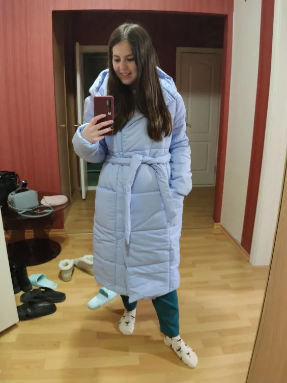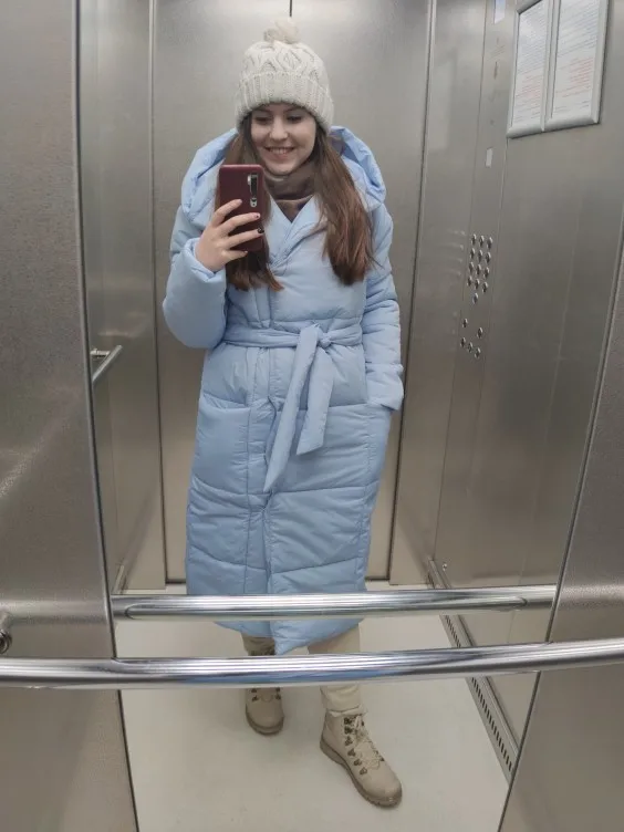 Down jacket is good. I ordered 11, came 24 (and it was delayed, called and apologized, because. Could not deliver to the delivery point I chose because of the size of the parcel). According to the store's picture, I thought that the down jacket was black, but in fact it was dark blue. Height 172; about 110; from 89; OG 100. The size approached, maybe ordered XL, but it was not and decided to risk, order L. The length below the knee is 15 cm, the length of the sleeve is almost to the bones, the clasp is only the button and the belt. I'm happy with the truck!