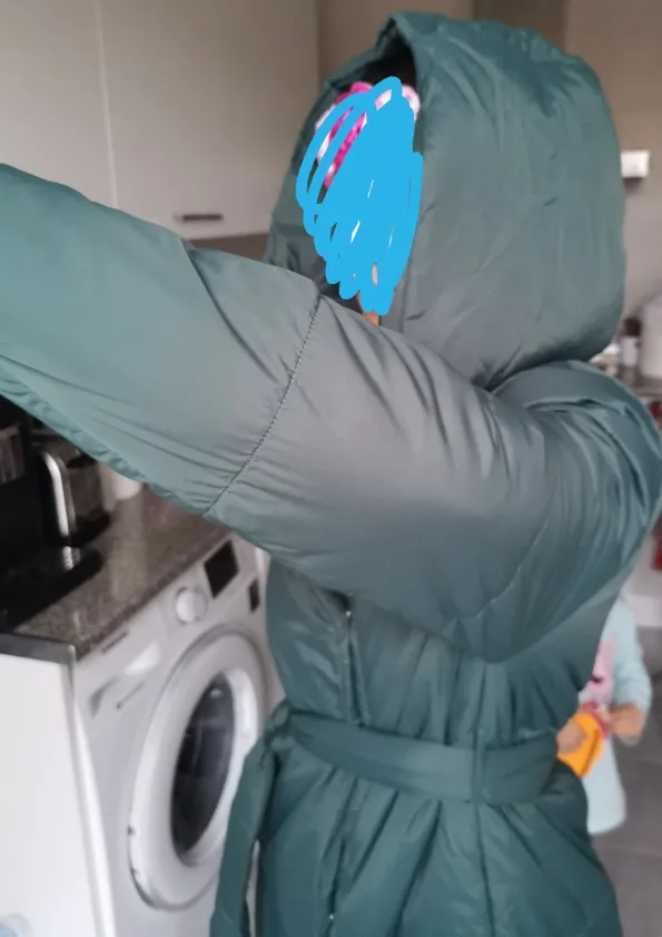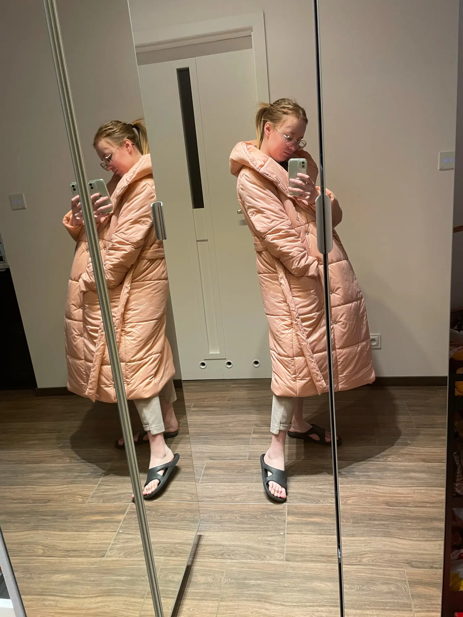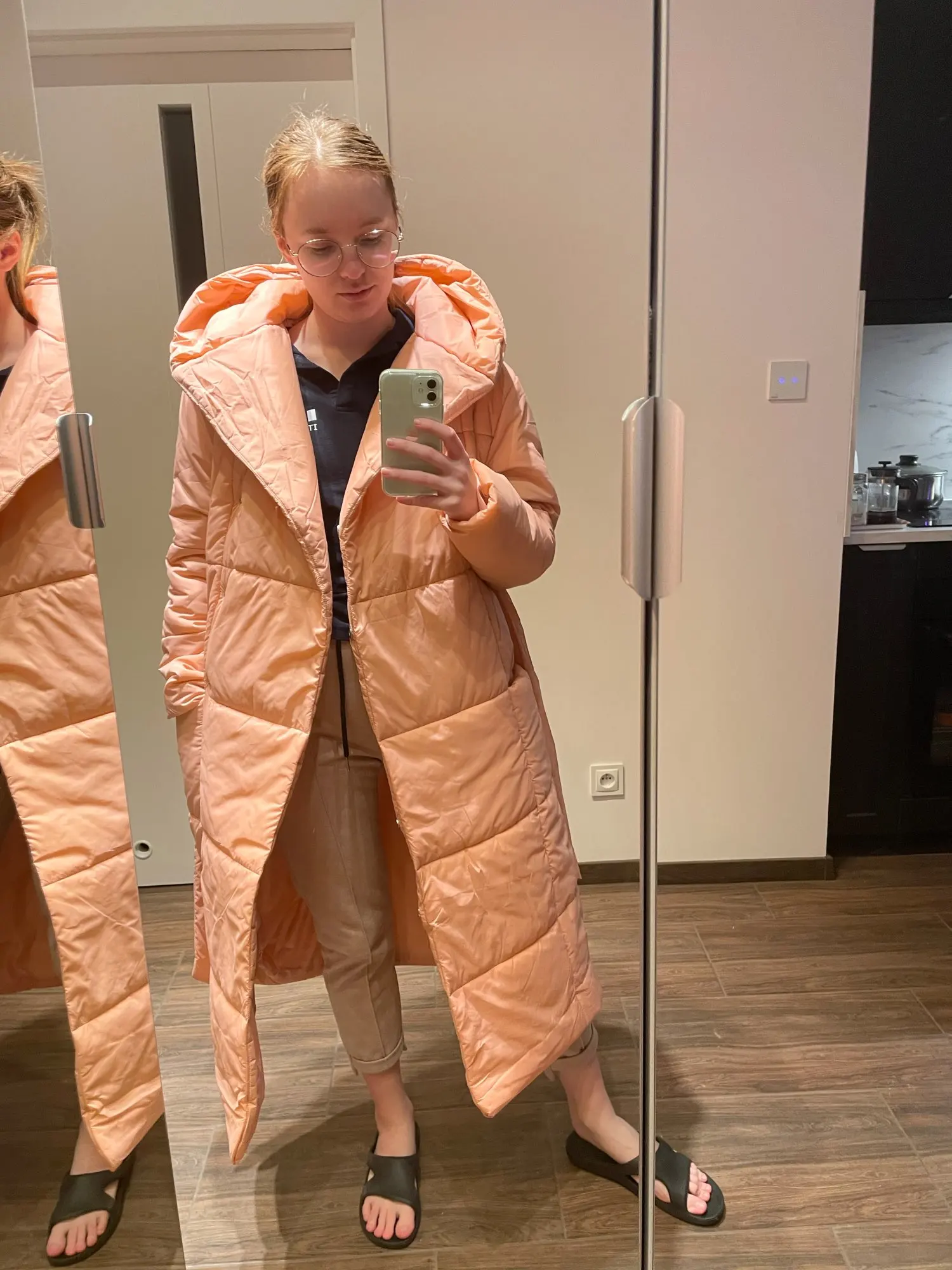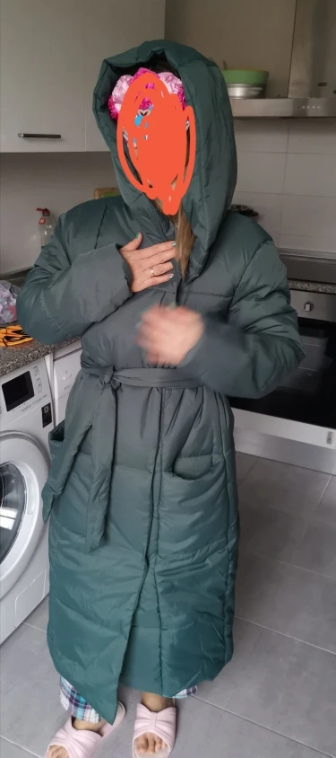 More in Insta @ viktoria_ron A good coat-jacket! Quality is fine. Warm, you can wear in winter (approximately up to 10 s/-15 with a warm layer and thermal underwear). Beautifully looks and with a sporty style and for an office wardrobe: with dresses/skirts perfectly combined. Beautiful heavenly color. On me s (I 85-65-90, height 165), not oversize, not too straight "blanket", good landing. The sleeve is not short for me. Quality is good.